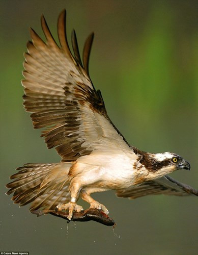 Sau đó, chim ưng biển vỗ cánh bay lên khỏi mặt nước cùng với con mồi được kẹp chặt ở chân của nó.