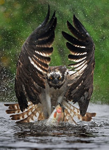 Khi phát hiện con cá lớn, chim ưng biển lao xuống dưới sông để săn mồi, khiến nước bắn tung tóe. Cảnh tượng chim ưng biển săn cá hồi diễn ra đầy ngoạn mục tại một con sông ở Cairngorms, Scotland.