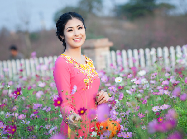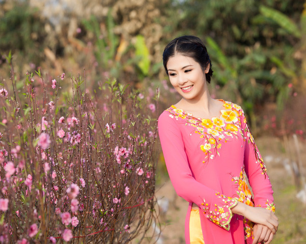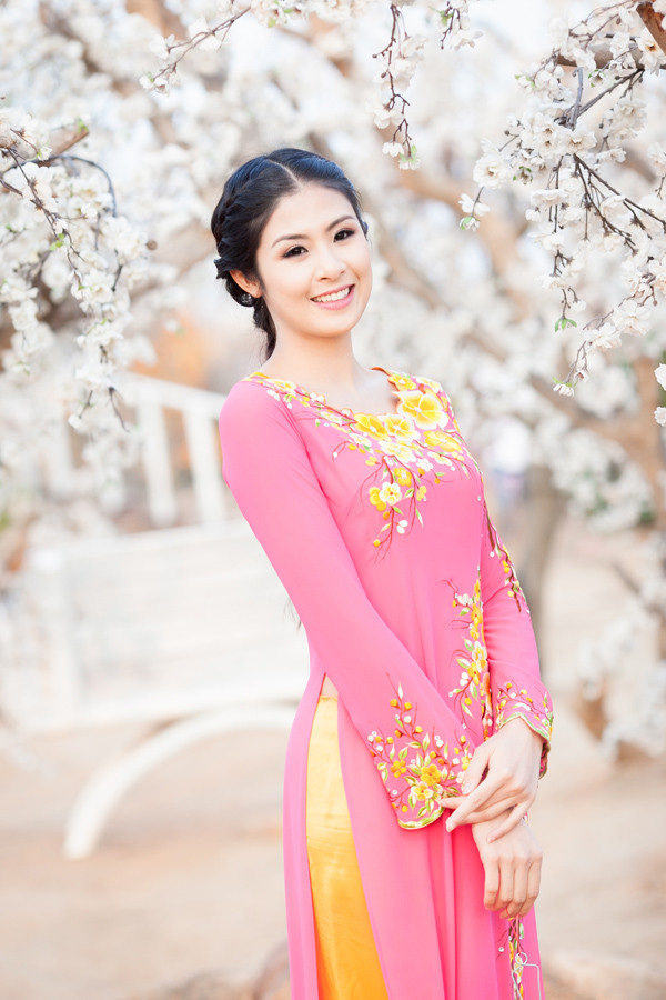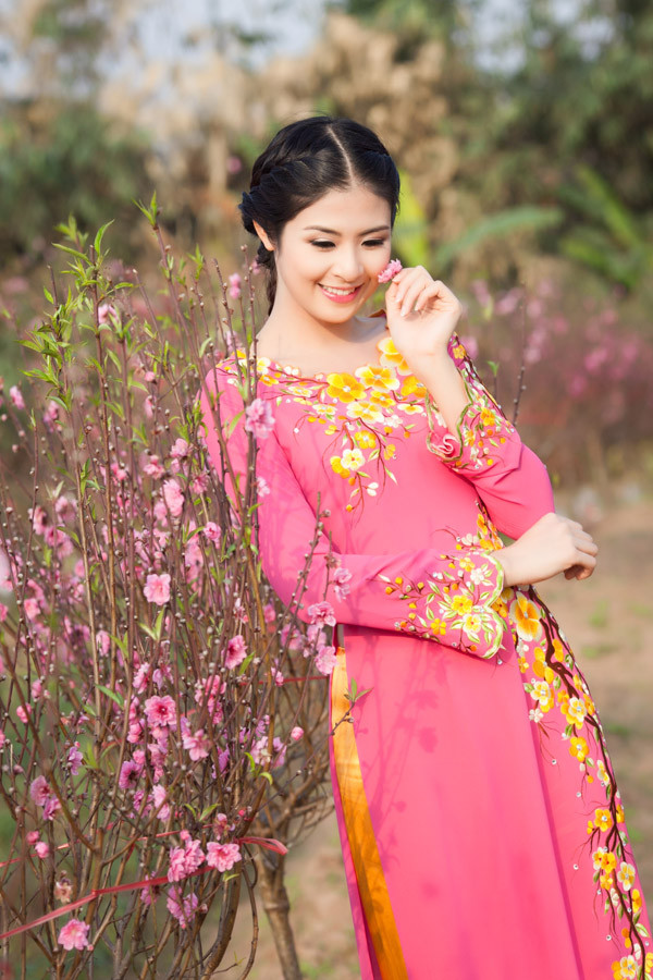Ngọc Hân dịu dàng với áo dài họa tiết hoa đào