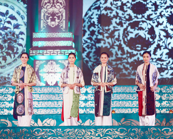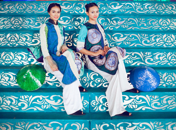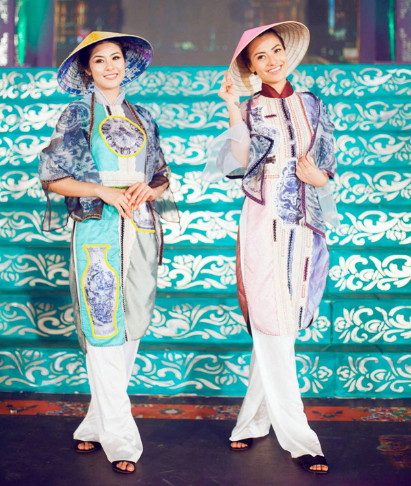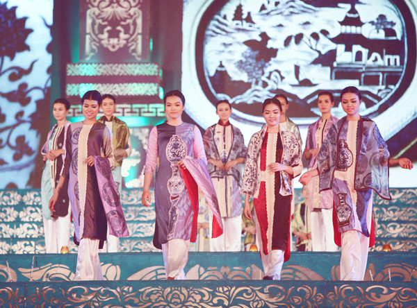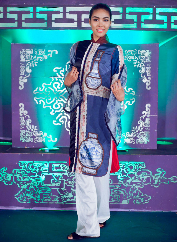Gốm men xanh biểu trưng cho một làng nghề xưa quý của dân tộc được NTK Võ Công Khanh đưa vào BST áo dài của mình giới thiệu tại Festival Huế 2014.
