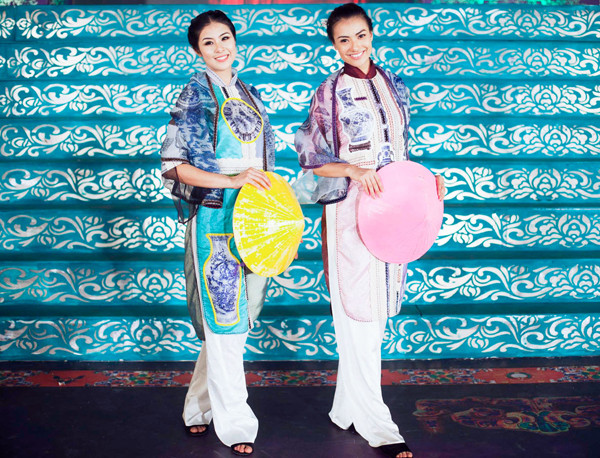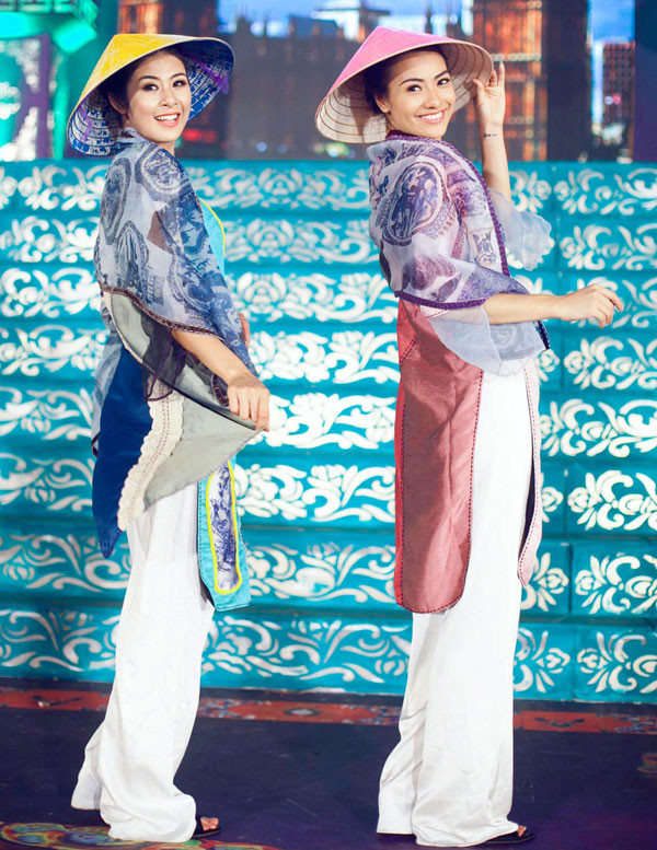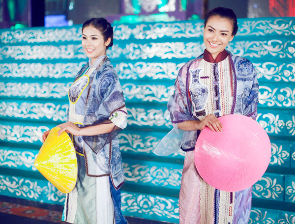 Tối 17/4, Hoa hậu VN 2010 Ngọc Hân và Hồng Quế trình diễn bộ sưu tập áo dài Gốm của NTK Võ Công Khanh tại Lễ hội áo dài trong khuôn khổ Festival Huế 2014.