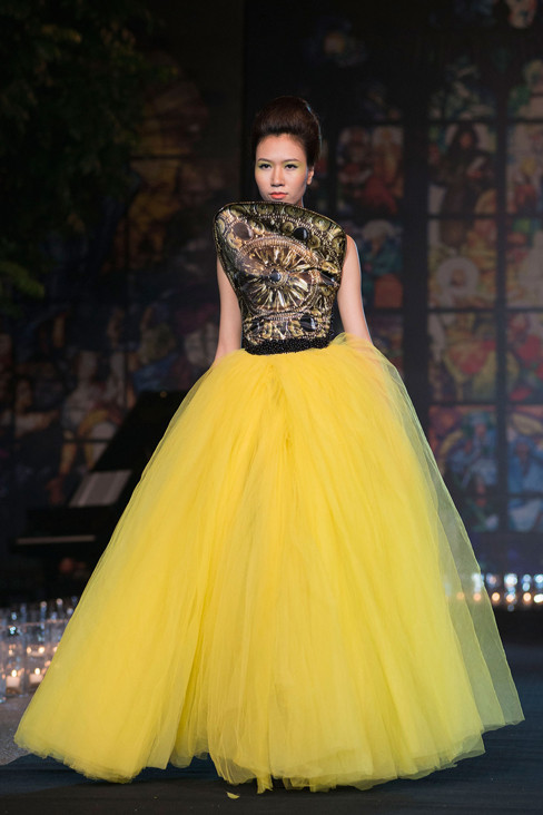 Bộ sưu tập độc đáo này được chuyển tải bằng công nghệ in trên nền vải lụa satin Việt Nam tạo hiệu quả về mạnh về thị giác với form dáng cấu trúc 3D hiện đại trên một tông màu vàng đầy sự huyền bí.