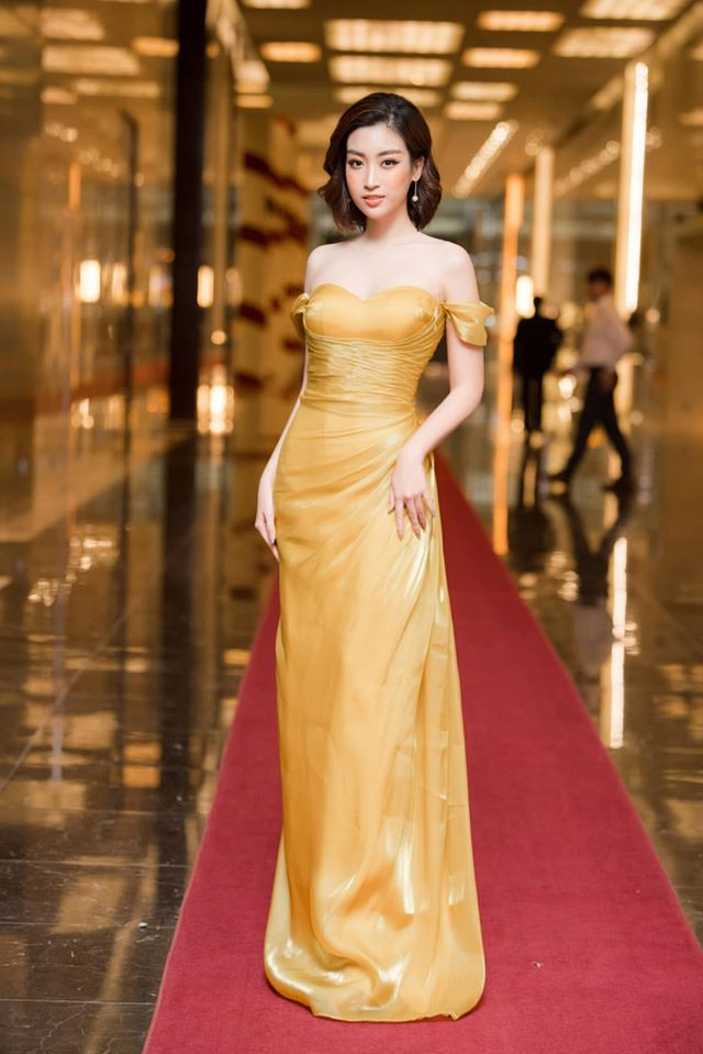 Bộ váy dạ hội màu vàng óng ả giúp Hoa hậu Việt Nam 2016 toả sáng tại sự kiện.