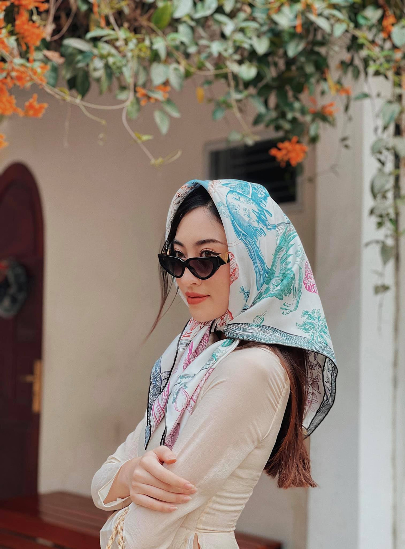 Người đẹp sử dụng phụ kiện khăn và kính mắt cực kỳ thời trang và tinh tế.