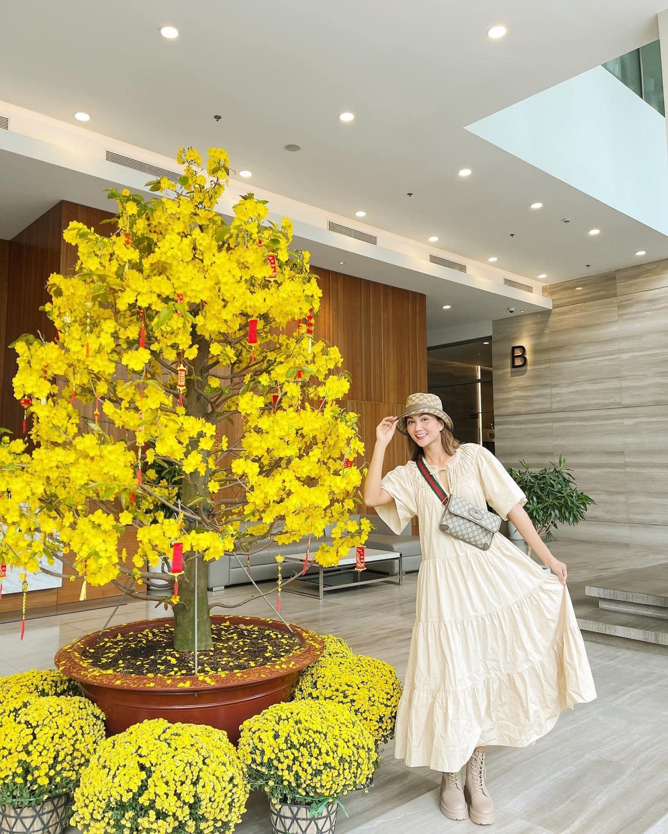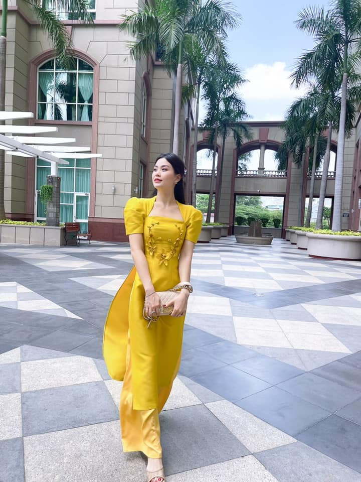 Á hậu Diễm Trang diện áo dài vàng rực rỡ khi đi làm vào ngày mùng 2 Tết.