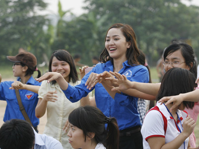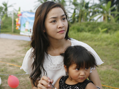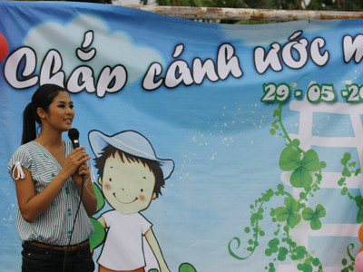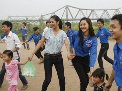 TPO - Chiều 29-5, Hoa hậu Việt Nam Ngọc Hân và Top 5 Hoa hậu Thế giới người Việt Phan Thị Lý cùng sinh viên trường Đại học Hà Nội đã xuống bãi giữa sông Hồng tổ chức Tết thiếu nhi cho 20 em nhỏ sinh sống trên các thuyền của xóm chài.