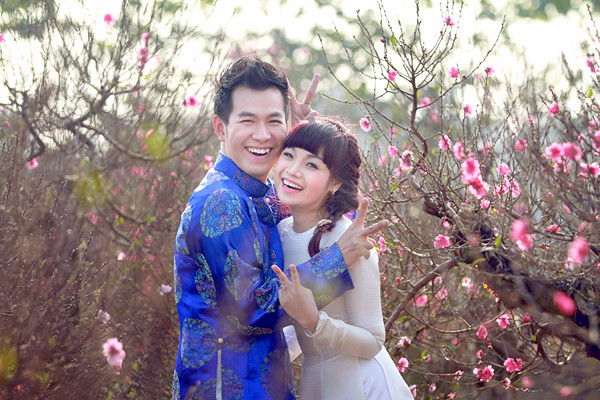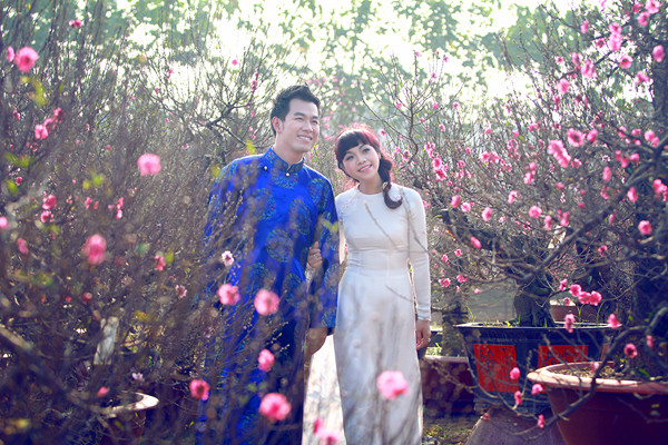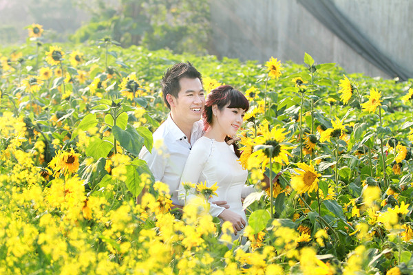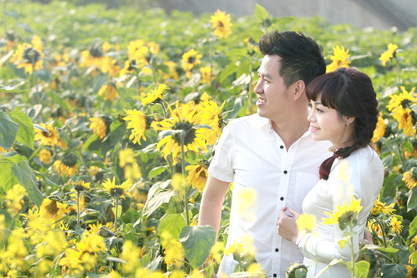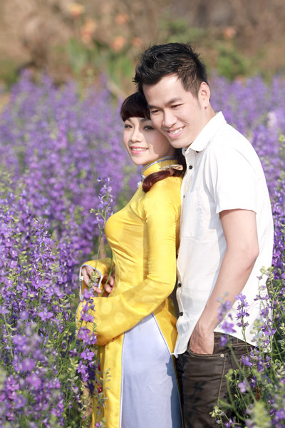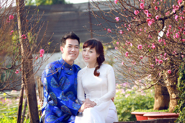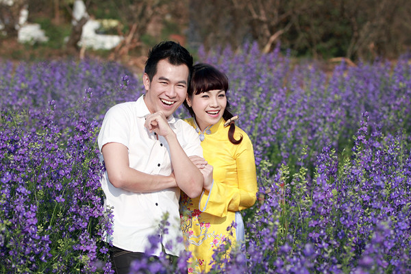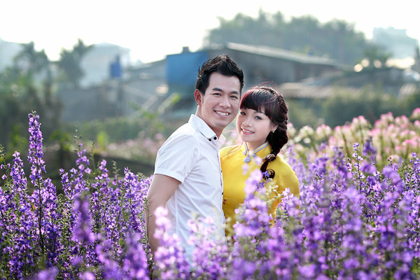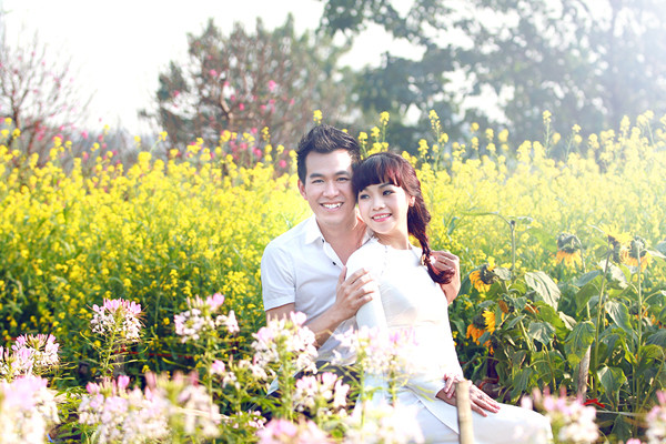 Diện áo dài trắng dịu dàng, Ngọc Khuê như cô gái chưa chồng, e ấp bên Hồ Trung Dũng.