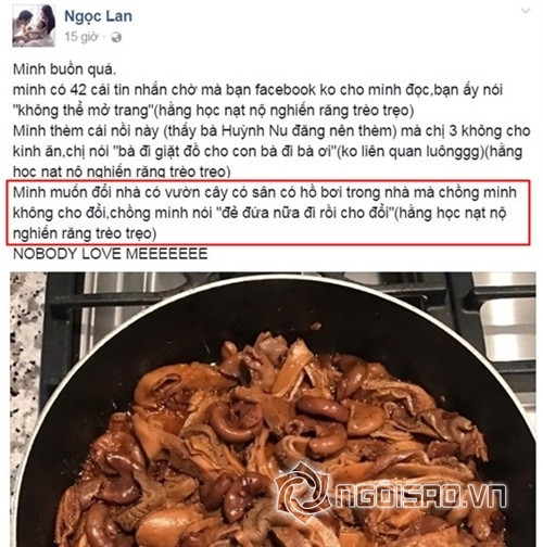 Nhiều người hâm mộ lo lắng khi đọc chia sẻ mới nhất của Ngọc Lan. Trong đó, nữ diễn viên viết: "Nói thiệt bây giờ không dám giữ con, không dám ôm con, không dám làm gì cho con, nghe con khóc ở ngoài cũng không dám dỗ. Vì mình tệ, mình không làm gì cho ra hồn, từ hồi sinh con tới giờ mình chưa làm việc gì mà đúng cả. Đây là bức ảnh cuối cùng mình đăng lên đây. Bây giờ chả muốn làm gì ngoài việc nhảy xuống sông, xuống biển chết cho rồi, mà khổ cái là biết bơi và bơi hơi bị giỏi".