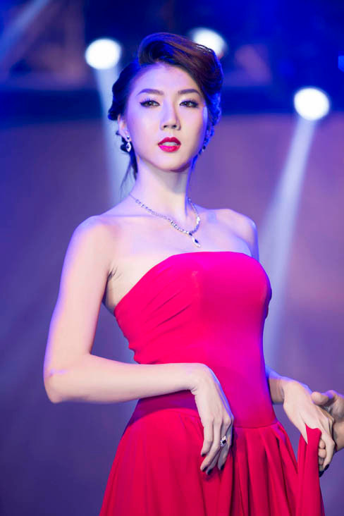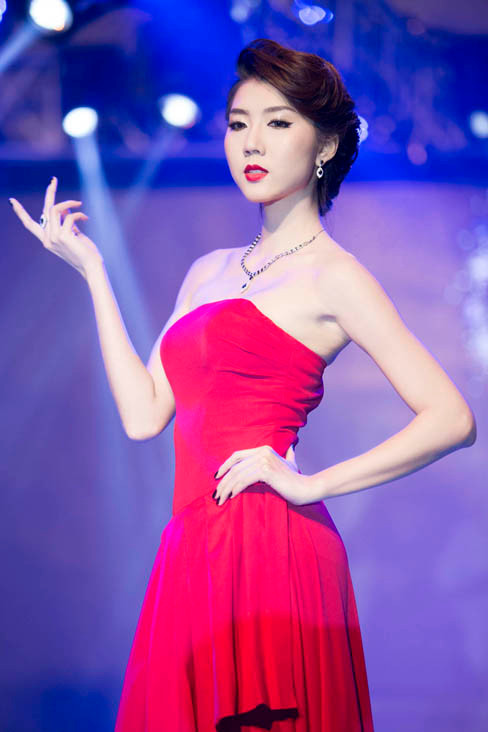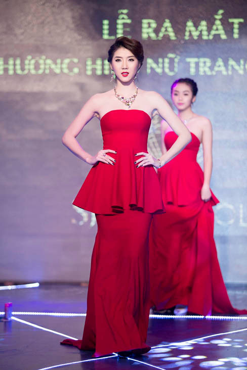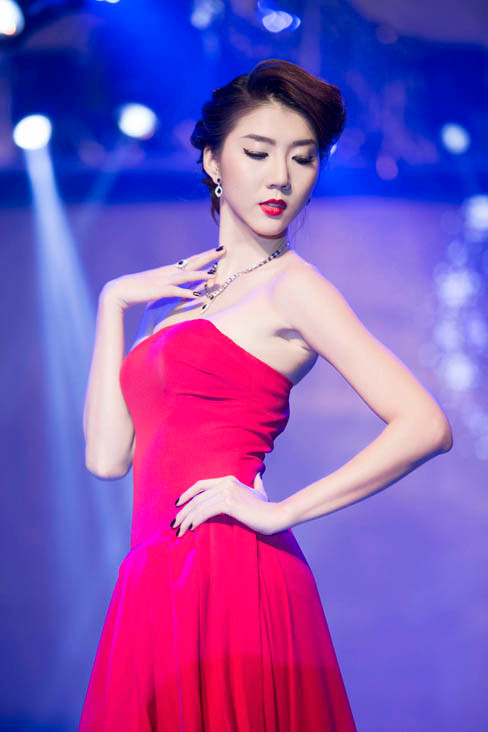 Sau đó, nữ người mẫu xuất hiện trên sàn catwalk trong vai trò vedette với bộ đầm dạ hội màu đỏ rực. Chiếc đầm thướt tha cúp ngực vừa đủ giúp cô khoe vòng một quyến rũ và làn da trắng mịn màng vô cùng nuột nà.