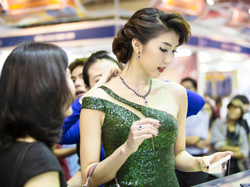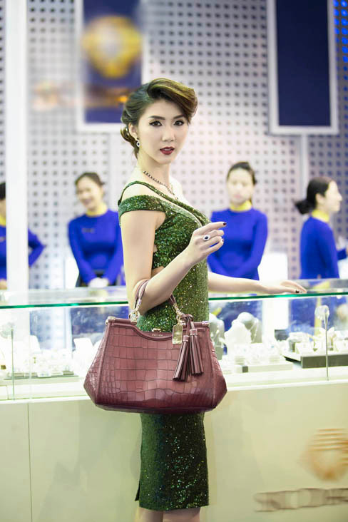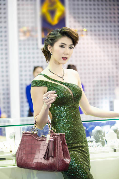 Xuất hiện tại sự kiện, Ngọc Quyên chọn bộ váy màu xanh ánh kim lấp lánh, cắt xẻ tinh tế khoe vòng một gợi cảm của nhà thiết kế Lê Thanh Hòa. Cô cũng trang điểm rất sang trọng, đài các để phù hợp với việc trình diễn trang sức.
