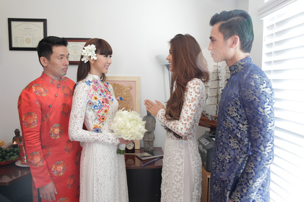 Tổ chức cưới tại xứ sở cờ hoa nhưng Ngọc Quyên chọn áo dài truyền thống trong ngày theo chàng về dinh. Cô diện áo dài ren trắng, có thêu hoa rực rỡ ở phần ngực áo. Toàn bộ trang phục áo dài, váy cưới của cô đều được các nhà thiết Thuận Việt, Đinh Anh Thơ ABC và Hoàng Hải gửi sang Mỹ.