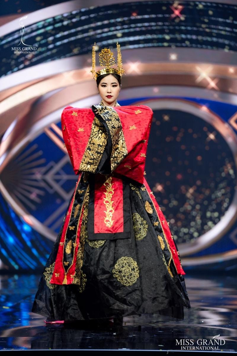 Vẫn như mọi lần, đại diện Việt Nam xuất hiện vào phút chót với thần thái tự tin và nổi bật. Á hậu Ngọc Thảo đã chọn bộ quốc phục mang tên Lá Ngọc Cành Vàng của NTK Tín Thái đến với đêm thi này. Bộ trang phục nặng gần 30kg đẹp lấp lánh ấn tượng.