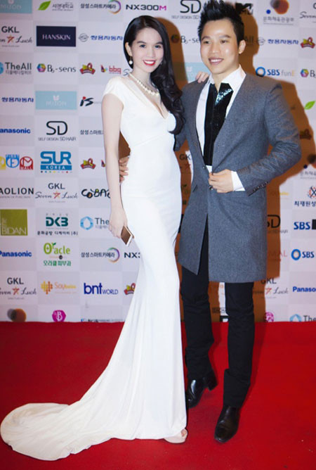 Trong Liên hoan người mẫu châu Á 2014 tại Hàn Quốc vừa diễn ra với sự tham dự của các người mẫu, ca sĩ và các diễn viên nổi tiếng của xứ sở Kim Chi, Ngọc Trinh và nhiều người đẹp Thái Hà, Minh Thư, Diệu Huyền, Vĩnh Thụy... là khách mời của chương trình này. "Nữ hoàng nội y" gây chý ý với chiếc đầm hiệu Valentino trị giá 200 triệu đồng cùng chiếc clutch hiệu Chanel đồng tông với trang phục.