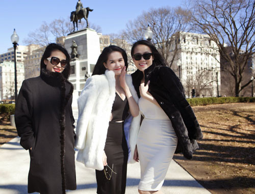 Á hậu 2008 - Minh Thư (trái) - trùm áo kín mít vì cô không chịu được cái lạnh của xứ người.