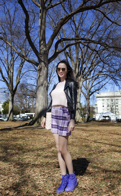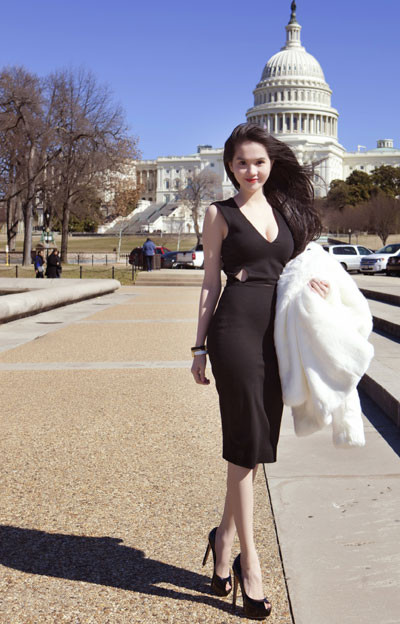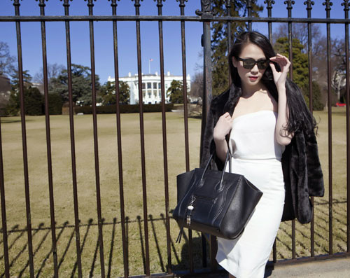 Thái Hà tạo dáng trước cổng khu Nhà Trắng.