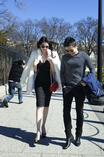 Cô chỉ khoác chiếc áo lông hờ hững trên vai cùng Vũ Khắc Tiệp (phải) tung tăng dạo phố.