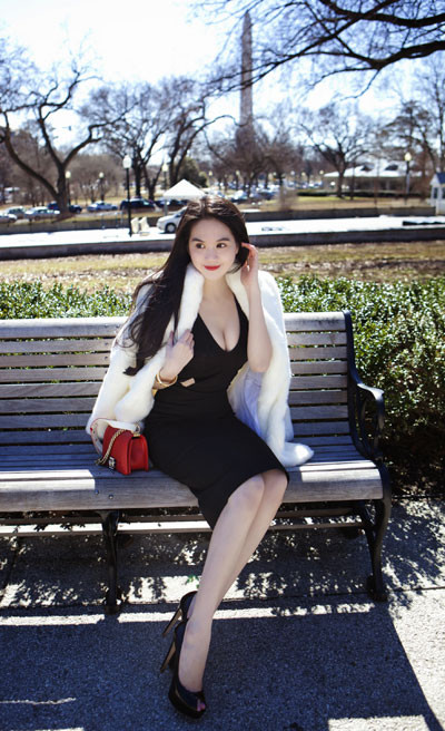 Hiện thời tiết ở thủ đô nước Mỹ là 4 độ C nhưng Ngọc Trinh vẫn diện váy mong manh, hở ngực, eo để có được những tấm ảnh đẹp, thu hút.