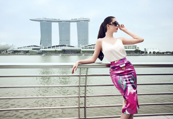 'Búp bê 9X' diện những bộ cánh thiết kế gợi cảm, tôn đường cong quyến rũ khi tới thăm đảo quốc sư tử.