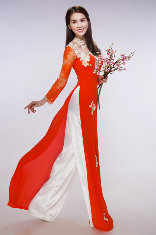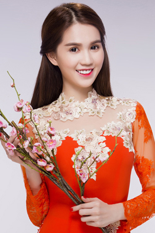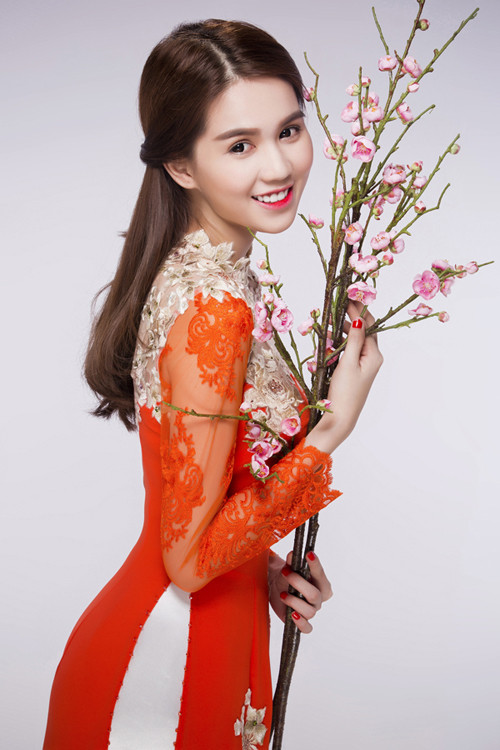 Ngọc Trinh vừa chụp ảnh với áo dài đỏ họa tiết hoa đào để chào năm mới. Cô tâm sự năm 2015 đã mua được nhà mới nên ăn Tết ở TP HCM. Cô mời bố mẹ từ Trà Vinh lên đón năm Bính Thân cùng mình.