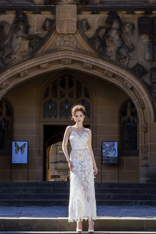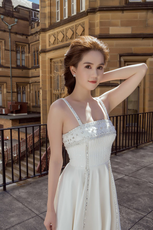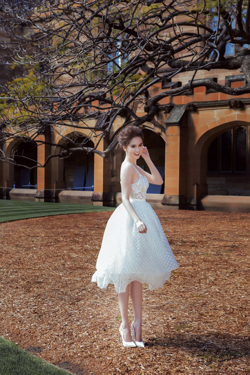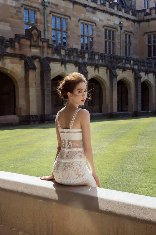 Ngọc Trinh thực hiện bộ ảnh thời trang tại khuôn viên của Đại học Sydney. Trong ảnh: cô mặc thiết kế xuyên thấu với những đường cắt laser ở phần lưng và vòng ba.