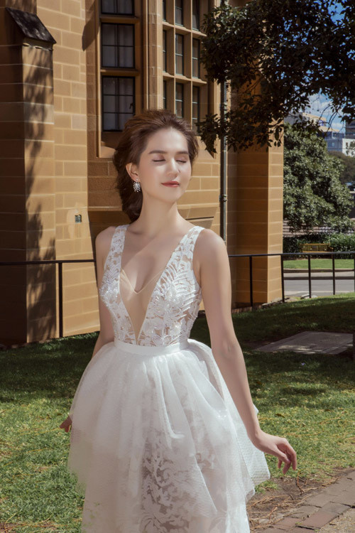 Bộ váy ôm sát giúp Ngọc Trinh tôn đường cong. Cô mang giày hiệu Dior. Nữ diễn viên đến Australia để tham dự Tuần Điện ảnh Việt Nam diễn ra tại Melbourne.