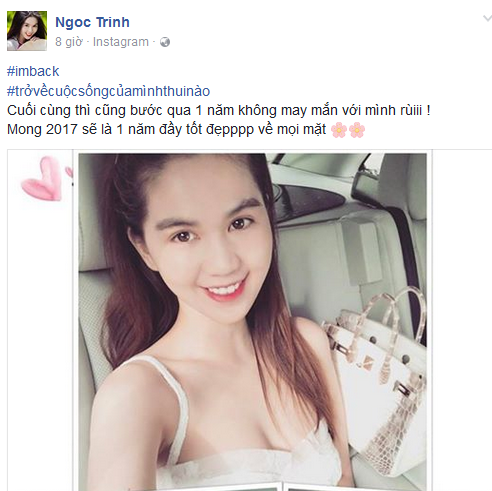 Còn Ngọc Trinh vẫn chọn cách im lặng. Sau khi bạn trai tuyên bố chia tay, Ngọc Trinh đã khóa tài khoản cá nhân trên mạng xã hội đồng thời không trả lời bất cứ phương tiện thông tin đại chúng nào. Cho đến cách đây ít giờ, Ngọc Trinh đăng tải hình ảnh cô nở nụ cười rạng rỡ kèm dòng trạng thái: “Cuối cùng thì cũng bước qua 1 năm không may mắn với mình rồi. Mong 2017 sẽ là 1 năm đầy tốt đẹp về mọi mặt”.