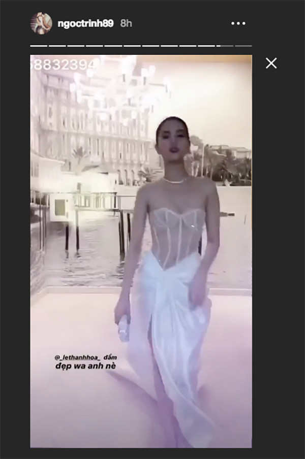 Cô diện bộ đầm dạ hội với phần trên bằng chất liệu xuyên thấu có kết cấu giống áo corset, phần dưới là vải lụa trắng cầu kỳ.