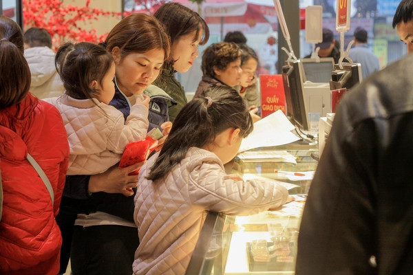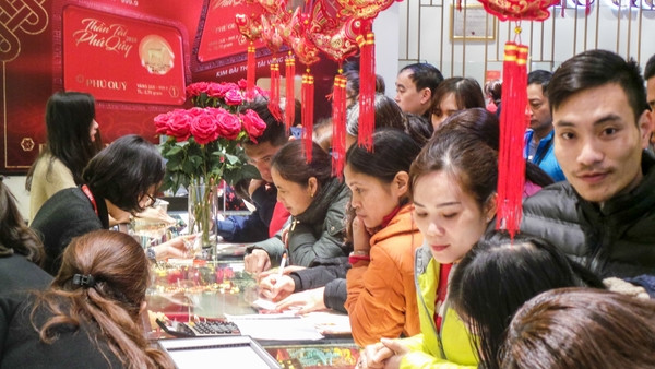 Sáng ngày 10 Âm lịch là ngày vía Thần tài, người dân đổ đến các cửa hàng mua vàng lấy may.
