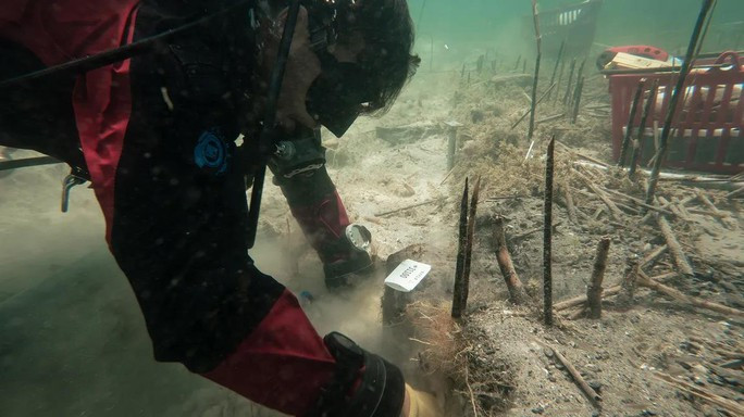 Tàn tích những cây cọc gỗ của nhà sàn và hàng rào phòng thủ được tìm thấy dưới đáy vùng nước nông của hồ - Ảnh: ĐẠI HỌC BERN