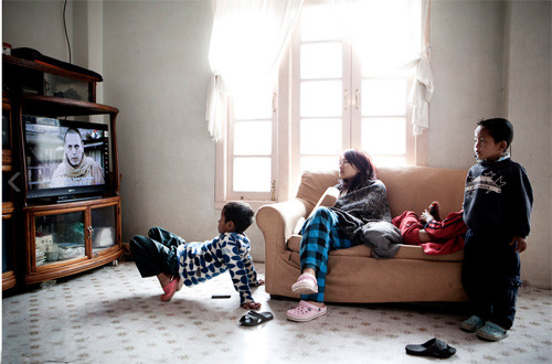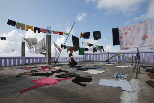 Hai người vợ Laltluangi (65 tuổi) và Thari (32 tuổi) xem phim bên hiên. Xung quanh ngôi nhà có một ban công kéo dài để phơi quần áo, làm lối lưu thông, ngồi chơi...