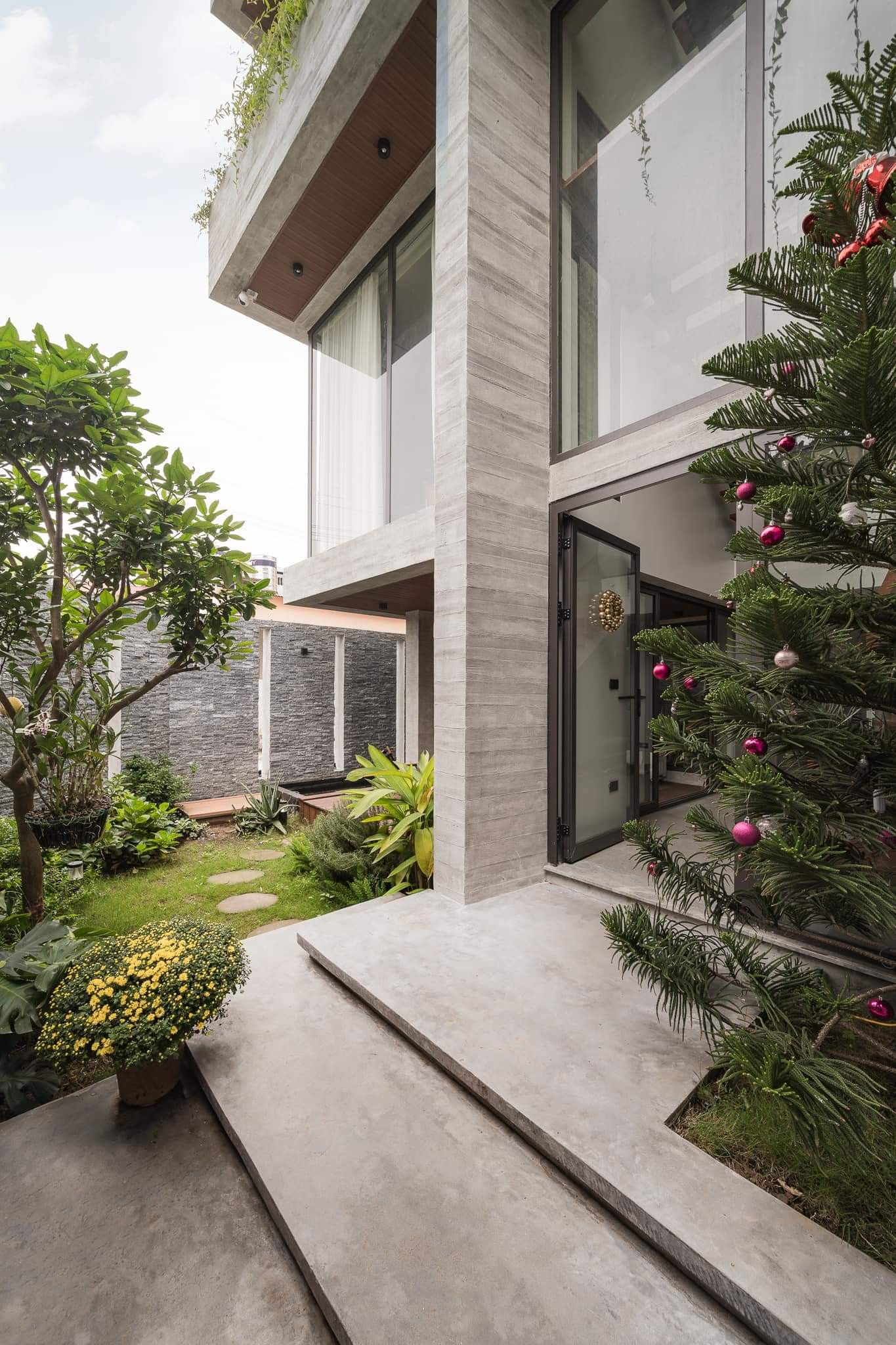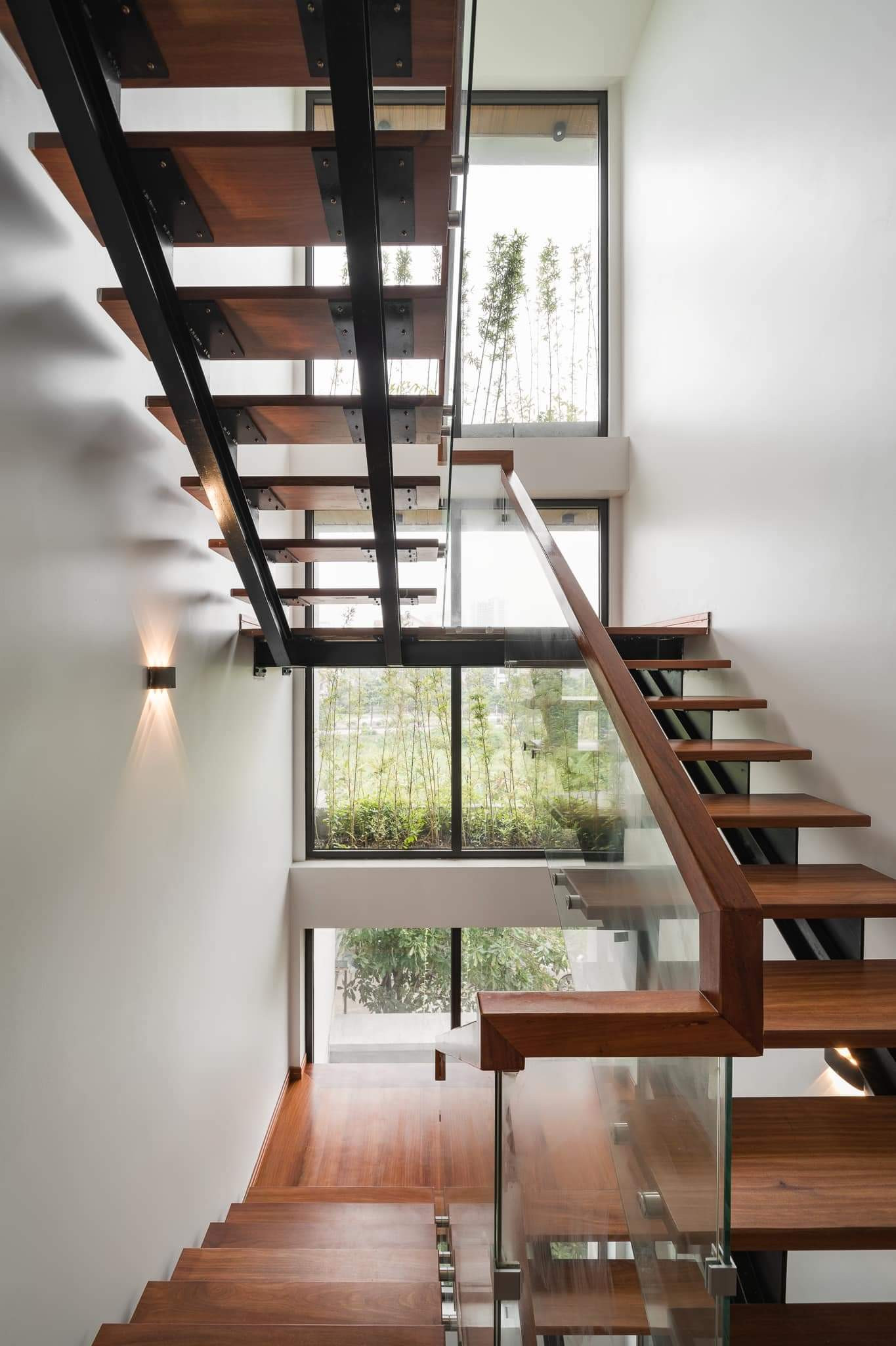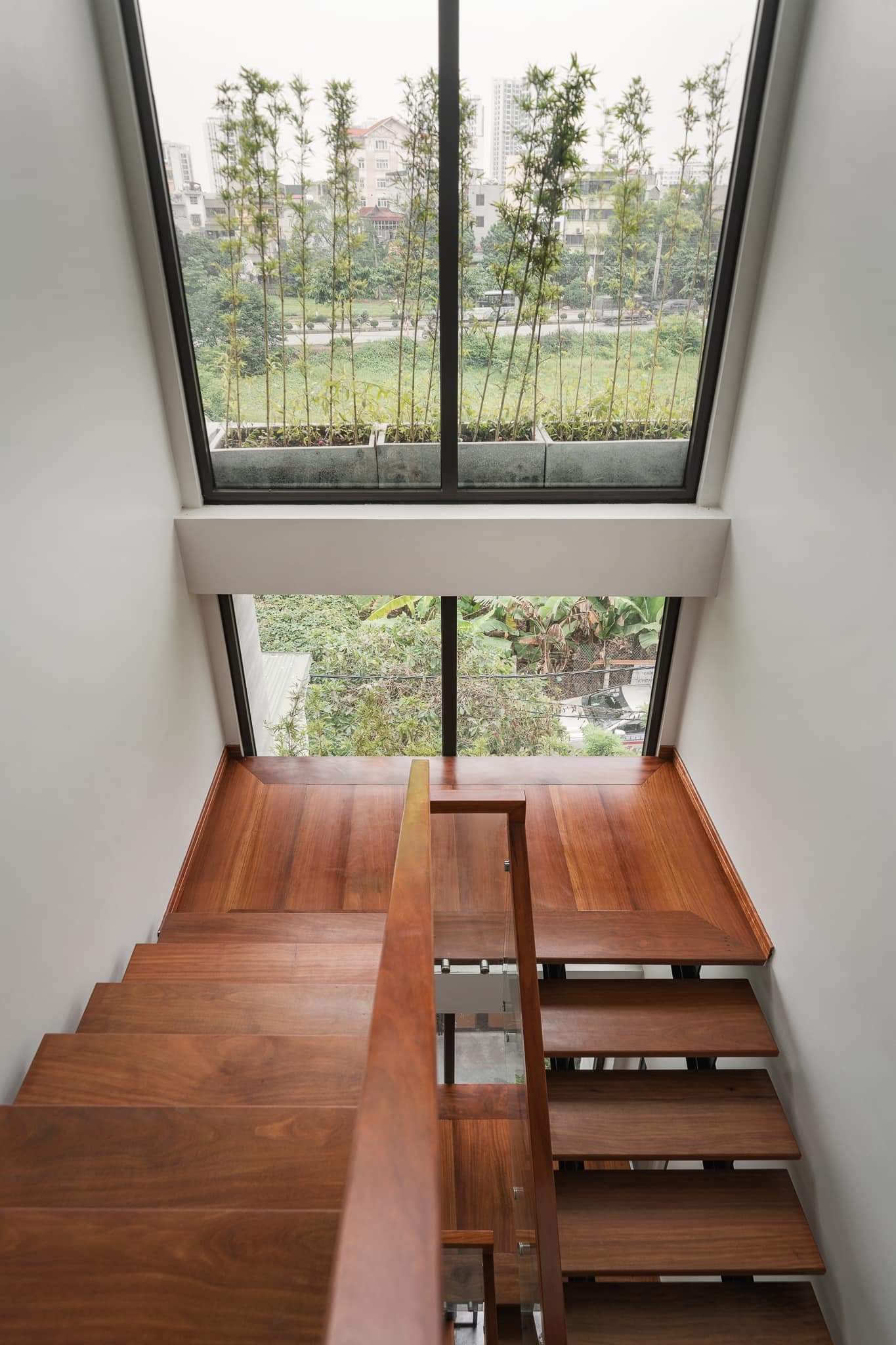 Mặt kính song song với cầu thang được thiết kế thêm các lô để trồng thêm trúc cảnh và cúc tần ấn độ, vừa tạo mảng xanh vừa đóng vai trò như rèm mát tự nhiên.