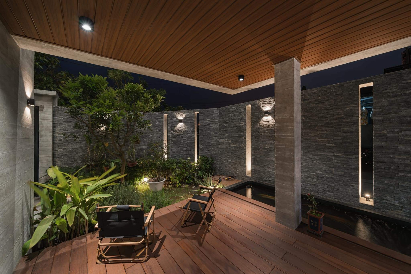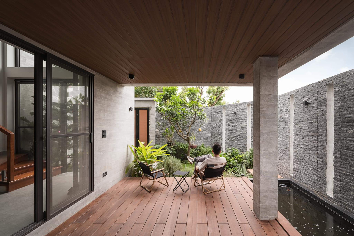Phần hiên hóng mát mở ra vườn trước là nơi gia chủ nghỉ ngơi thư giãn, tại đây cả gia đình có thể tụ họp, cùng nhau ăn uống, trò chuyện.