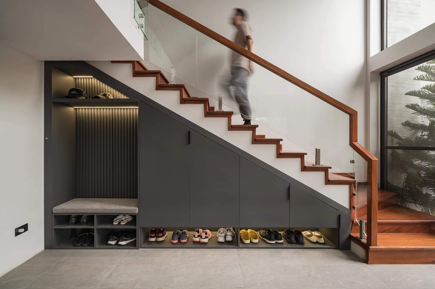 | Thiết kế hiện đại và thông minh tận dụng gầm cầu thang làm nơi lưu trữ đồ đạc và giày dép |