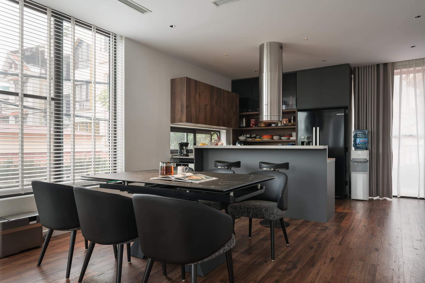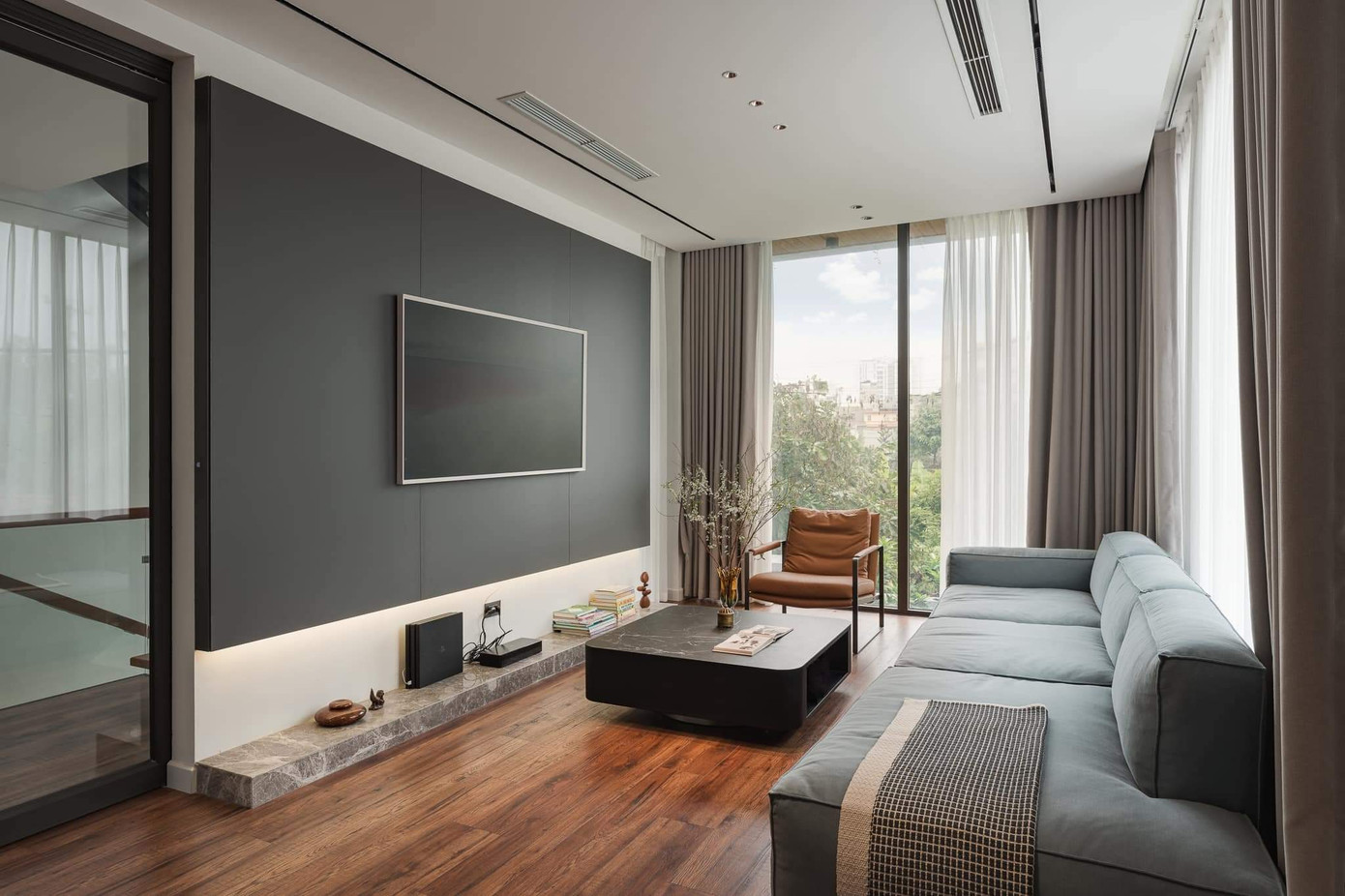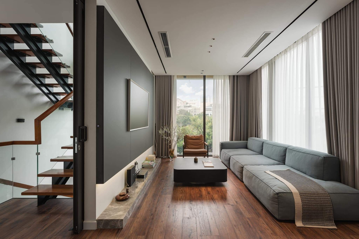 Thay vì sử dụng giếng trời, tận dụng vị trí 2 mặt tiền nhà, KTS sử sụng giải pháp lấy sáng tự nhiên từ hành lang giao thông là tường kính và cầu thang xương cá, cùng với các hệ cửa kính ở cạnh mặt tiền. Nhờ đó, ánh sáng tự nhiên được phân bổ khắp không gian và có thể được điều tiết bằng rèm hai lớp.