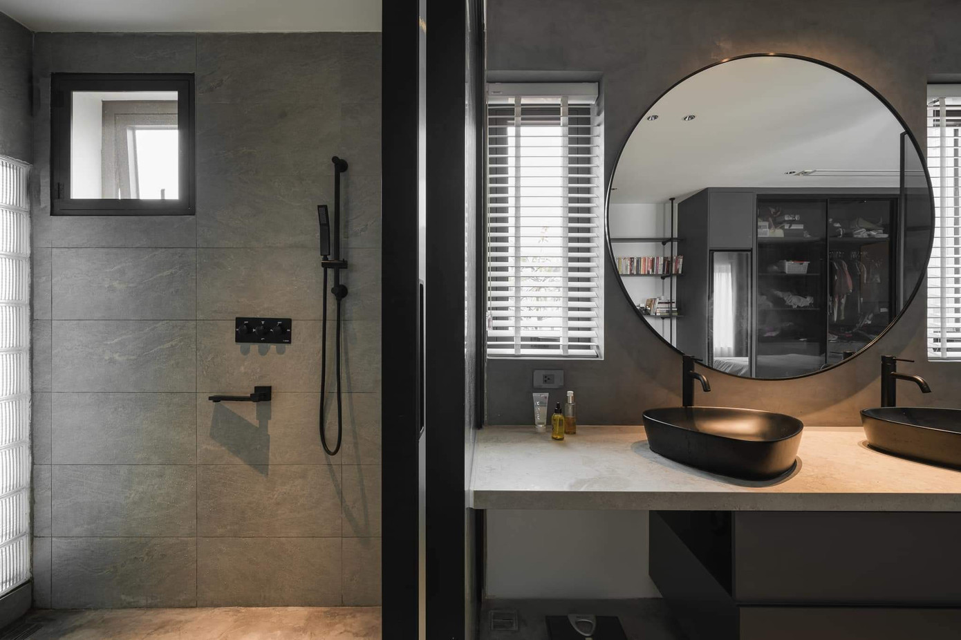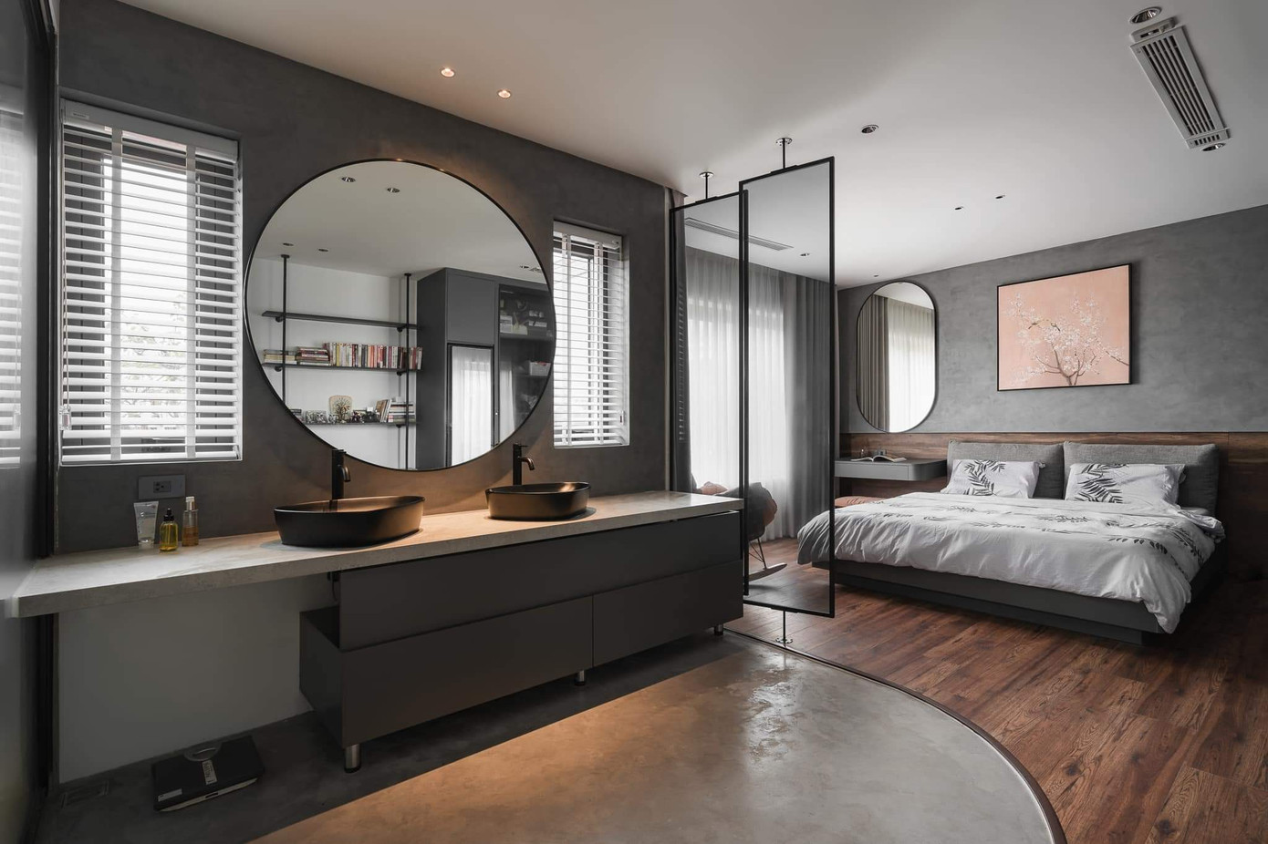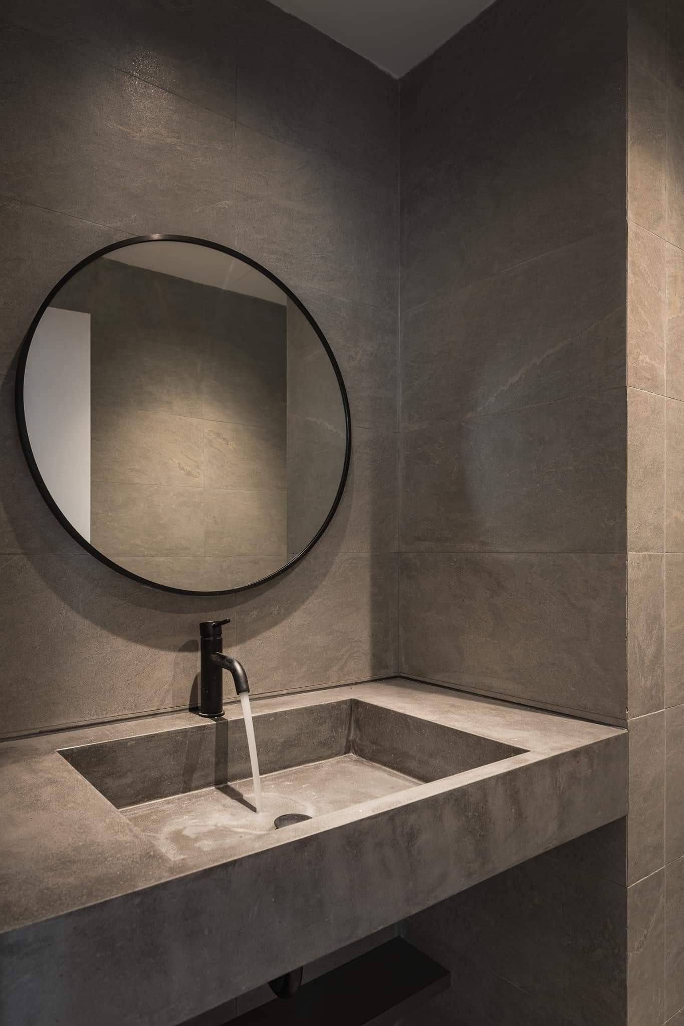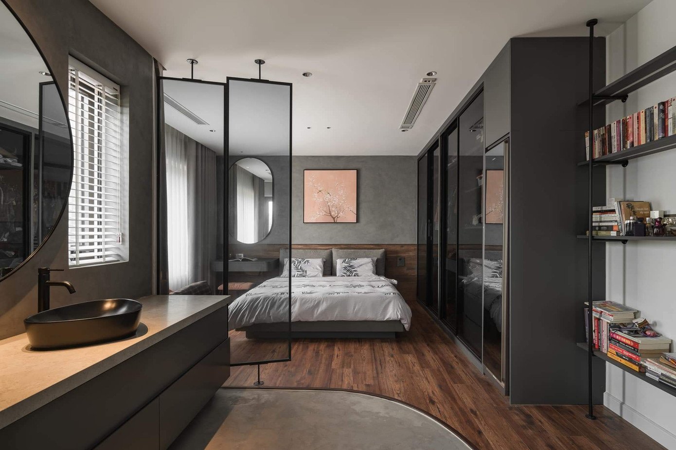Thay vì sử dụng giếng trời, tận dụng vị trí 2 mặt tiền nhà, KTS sử sụng giải pháp lấy sáng tự nhiên từ hành lang giao thông là tường kính và cầu thang xương cá, cùng với các hệ cửa kính ở cạnh mặt tiền. Nhờ đó, ánh sáng tự nhiên được phân bổ khắp không gian và có thể được điều tiết bằng rèm hai lớp.