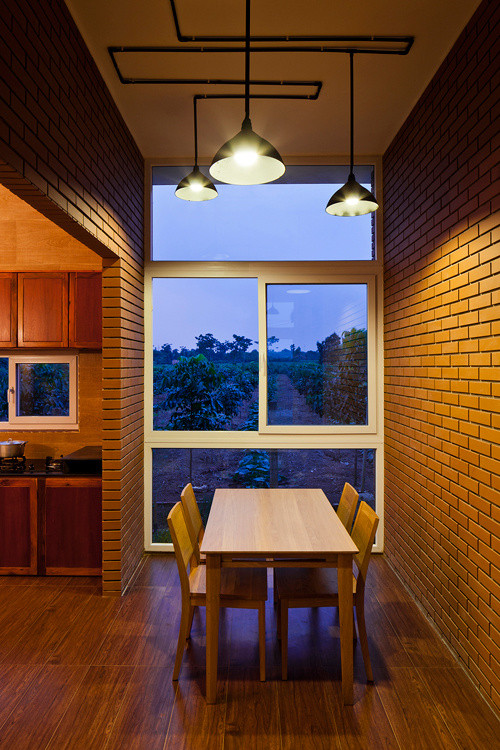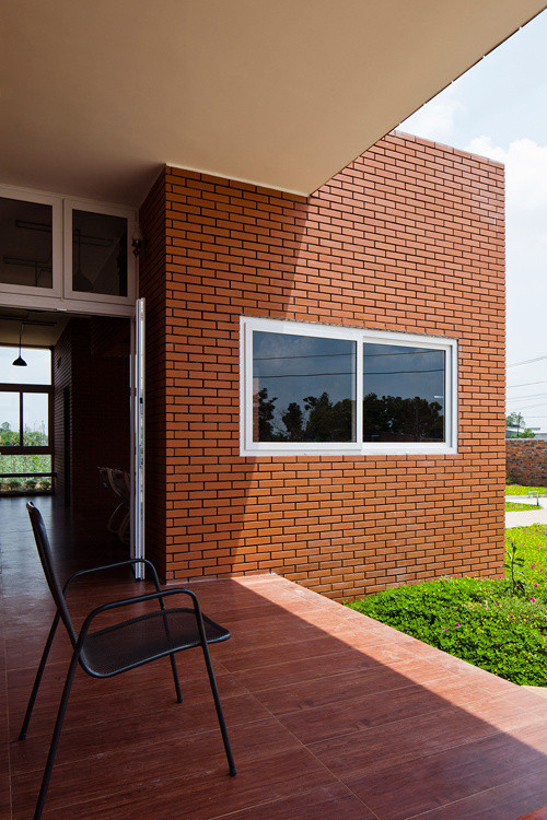 Màu gạch đỏ, sàn gỗ nâu cùng đèn bố trí hợp lý giúp ngôi nhà có cảm giác ấm cúng. Phòng nào trong nhà cũng có thể nhìn ra khung cảnh thoáng rộng bên ngoài.