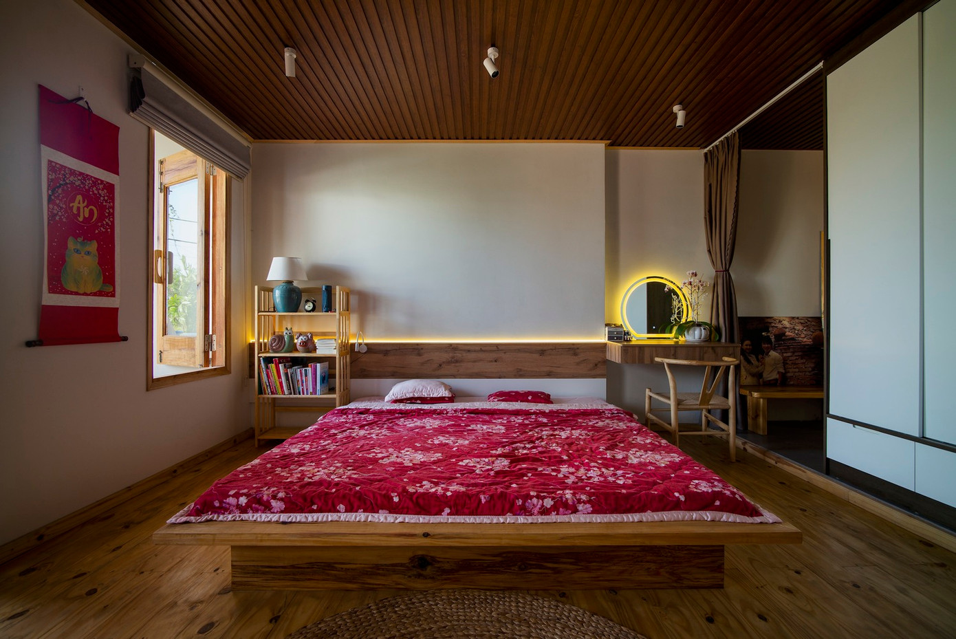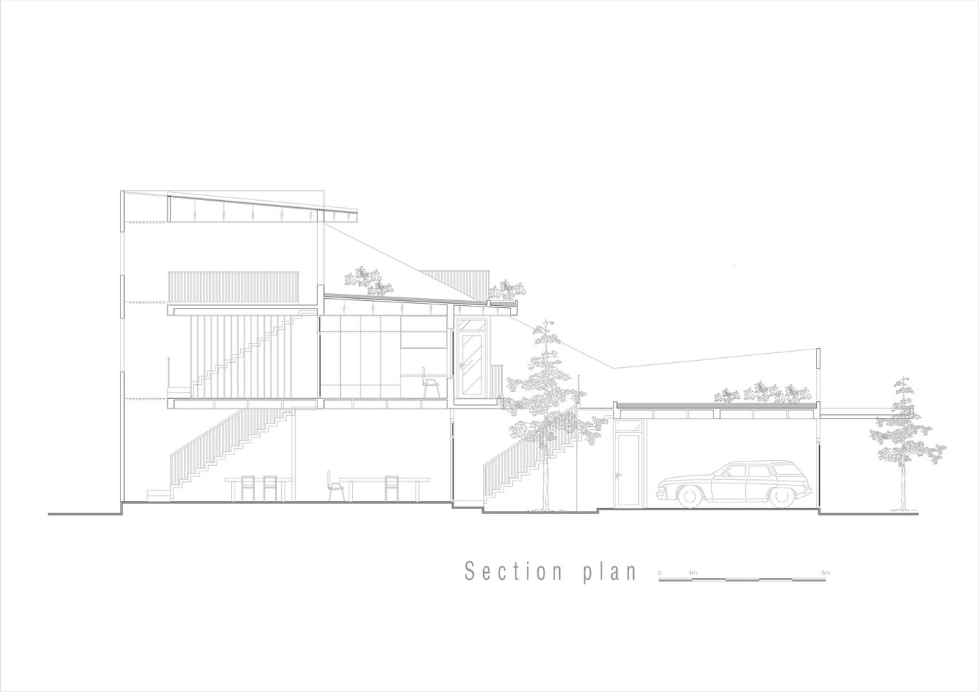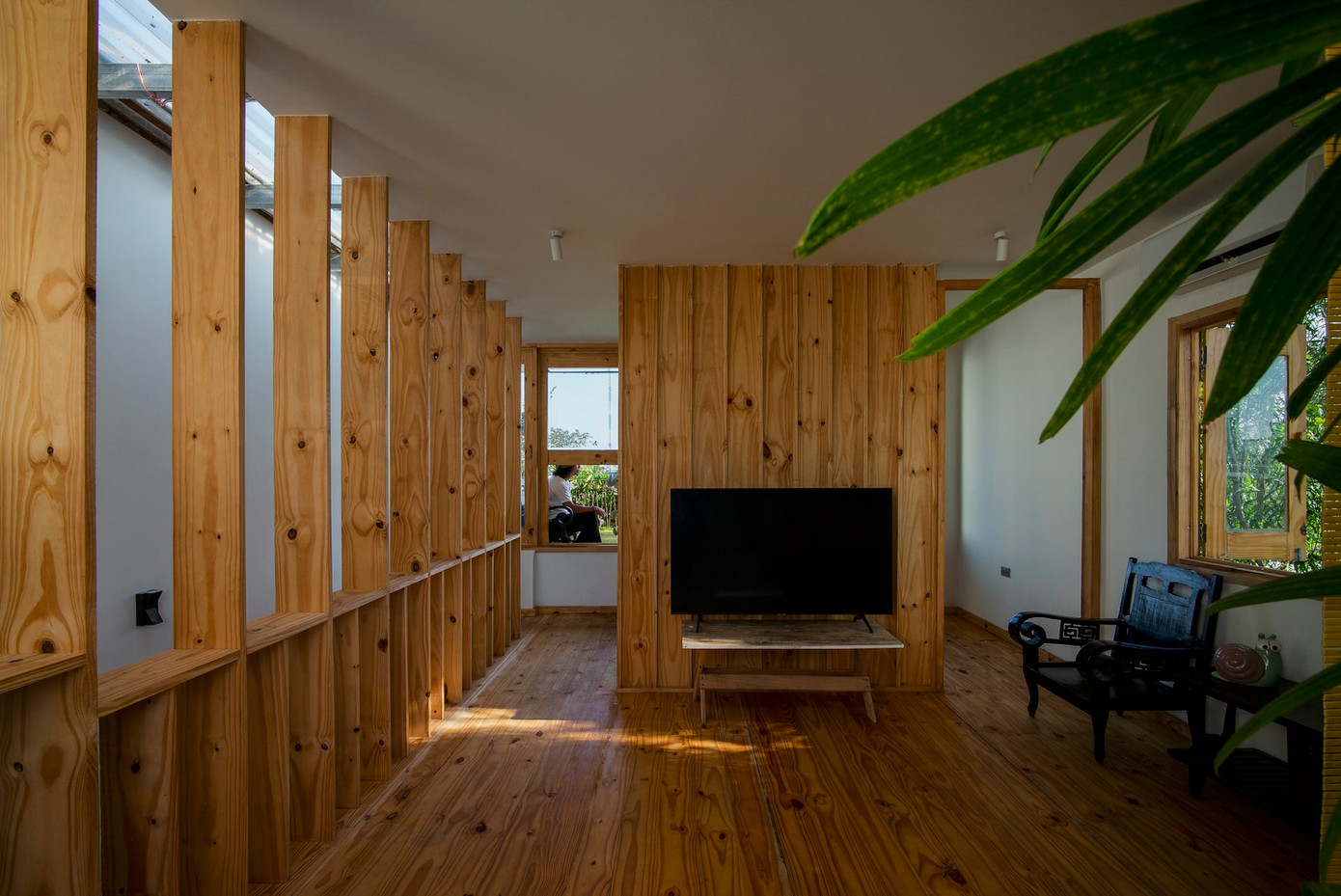 Ngôi nhà có thiết kế đặc biệt như chiếc tổ dế mèn, việc thu gọn khối nhà ở tầng hai để bố trí sân vườn phía trên tầng một giúp toàn bộ khu vực sinh hoạt chung giống như đang ở dưới lòng đất.