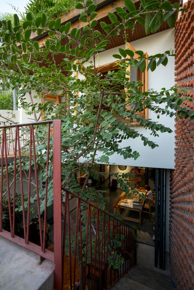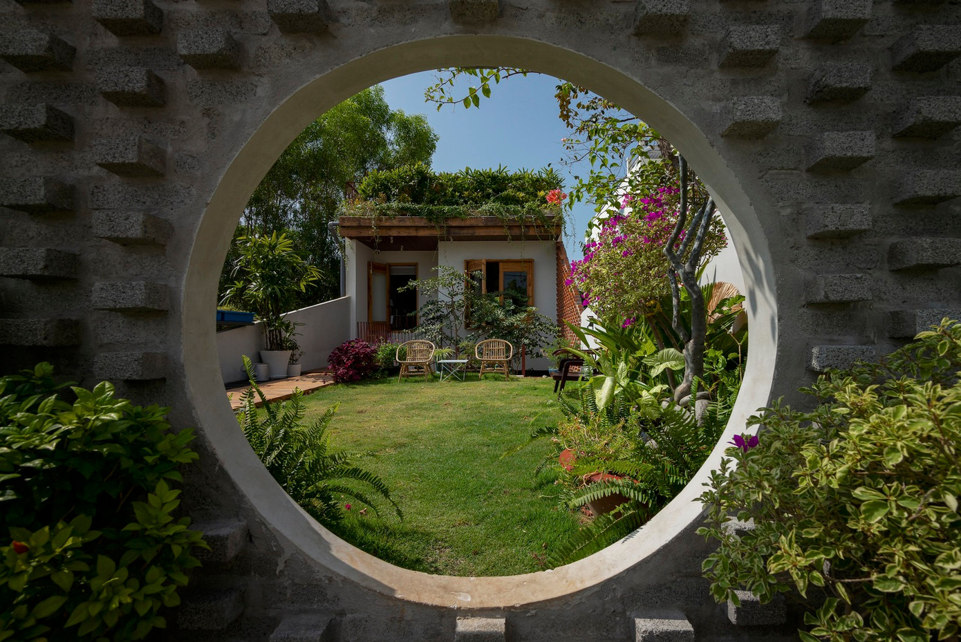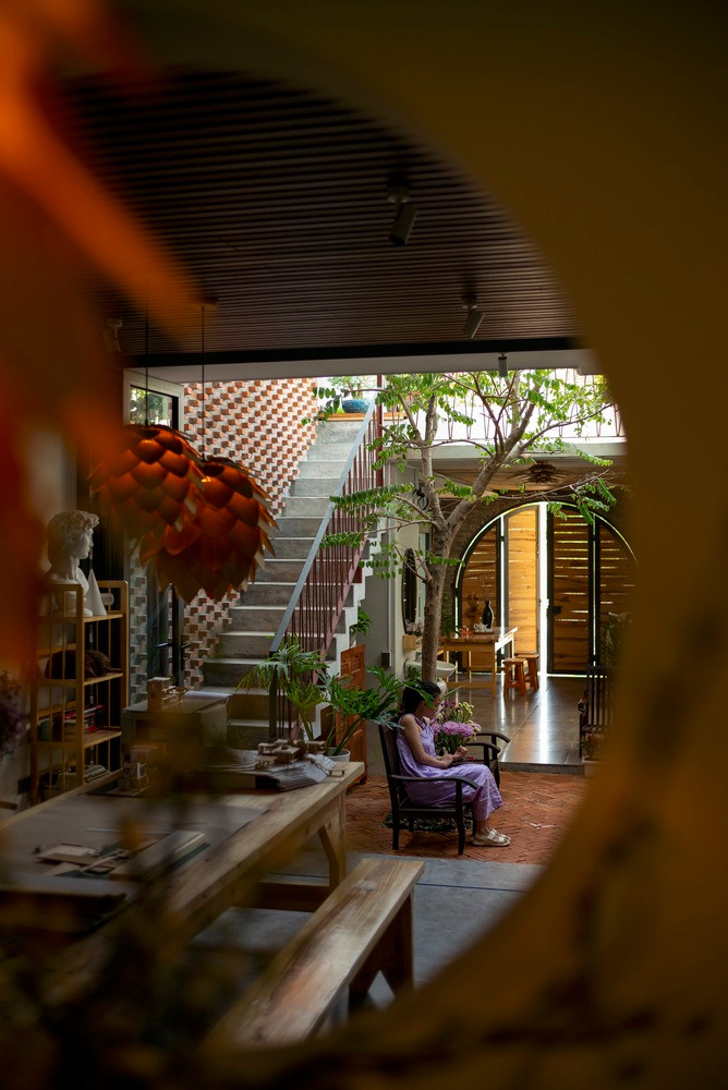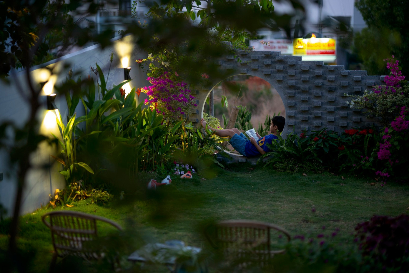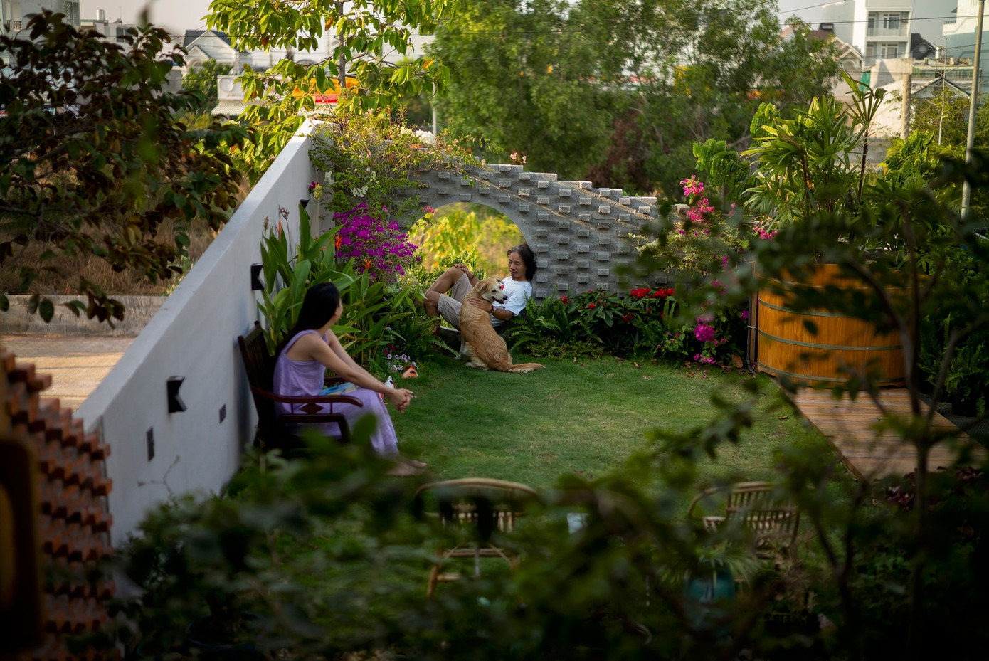 Ấn tượng nhất chính là khu vườn mở về phía bầu trời nhờ được đặt ở tầng 2, không gian xanh mát với cửa tròn gợi nhớ về ngôi nhà của dế mèn trong tác phẩm của nhà văn Tô Hoài, nơi anh ngắm trăng, hóng gió, vuốt râu và luyện tập.