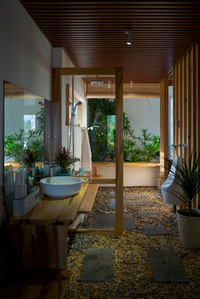 Ngôi nhà gây ấn tượng với phần sân vườn xanh mát bố trí khéo léo khắp nhà, đan xen với khối kiến trúc tạo ra một không gian hài hòa, ưu sinh.