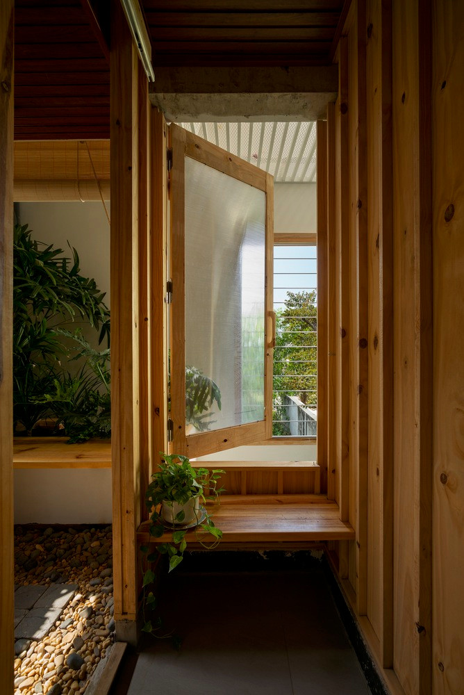 Gỗ được lựa chọn là vật liệu chính cho cầu thang, tầng hai và ba tạo cảm giác mộc mạc và thân thiện.