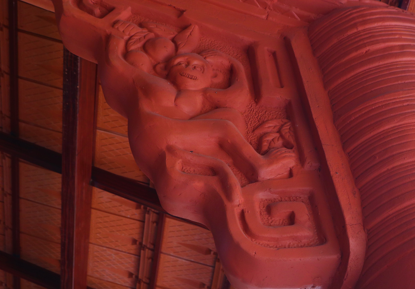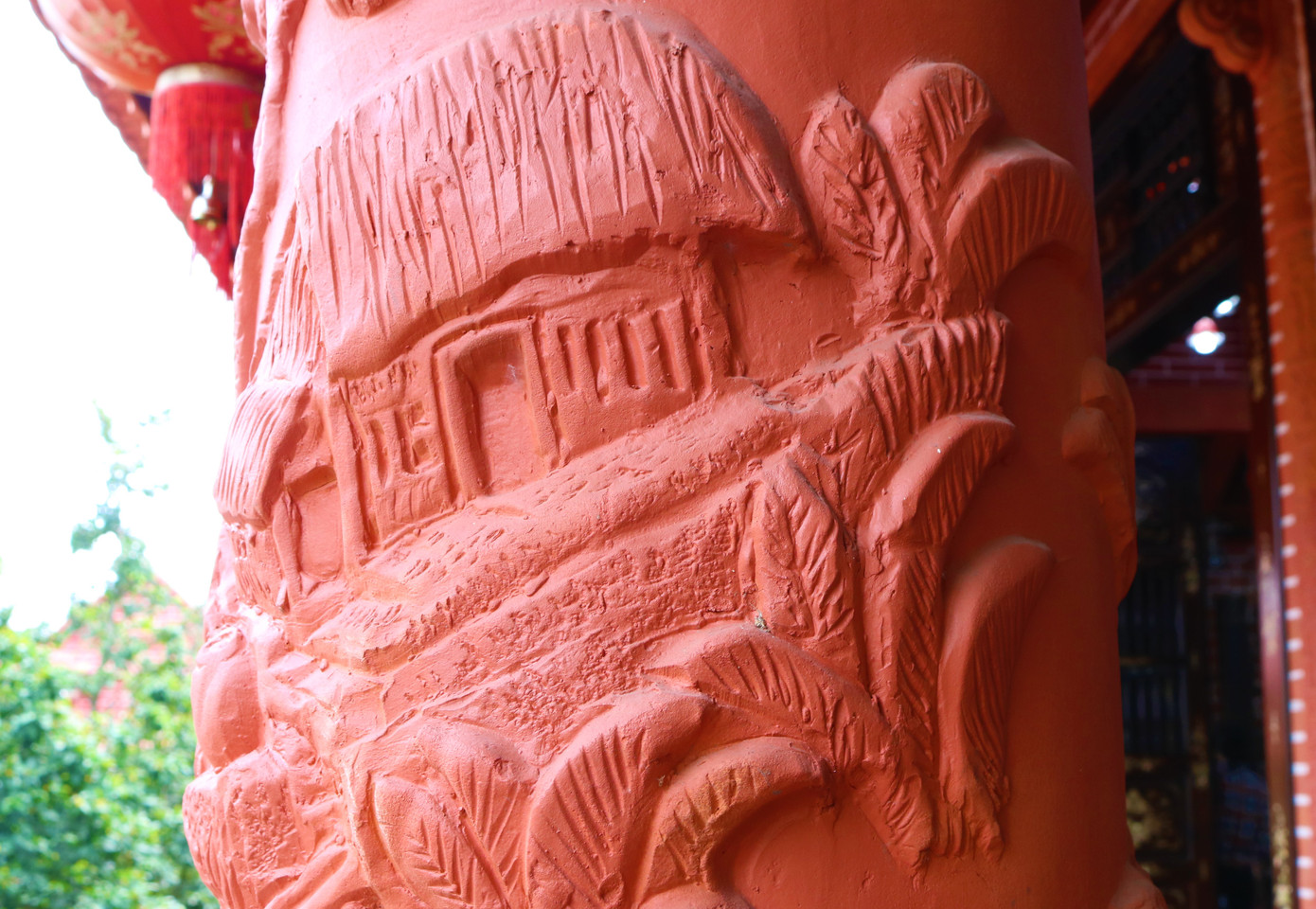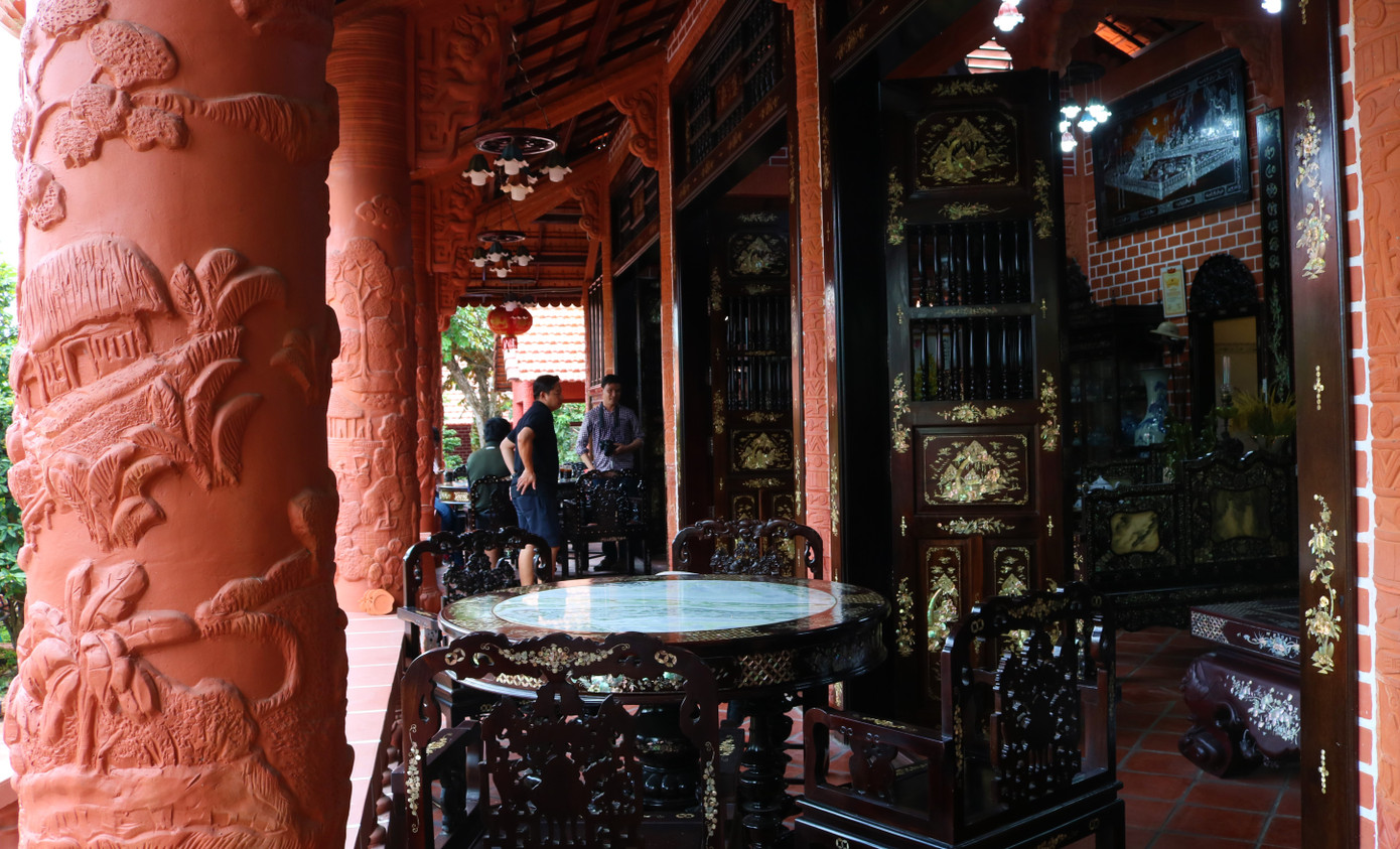 Gian chính của ngôi nhà gốm - Ảnh: Kim Hà. Ông Buôl chia sẻ: “Tôi thấy nguồn đất đỏ của Vĩnh Long mình có thể làm được những sản phẩm lớn như: Cột, bình 4 – 5m và nó giữ được kỉ lục quốc gia nên tôi nghĩ với kích thước như vậy thì mình có thể làm được cột, kèo, hoa văn để xây dựng một ngôi nhà theo kiểu Nam Bộ. Từ đó, tôi mới sáng tác ra, rồi làm nhà theo kiểu truyền thống là nhà 3 gian, 2 chái để gia đình sử dụng”.