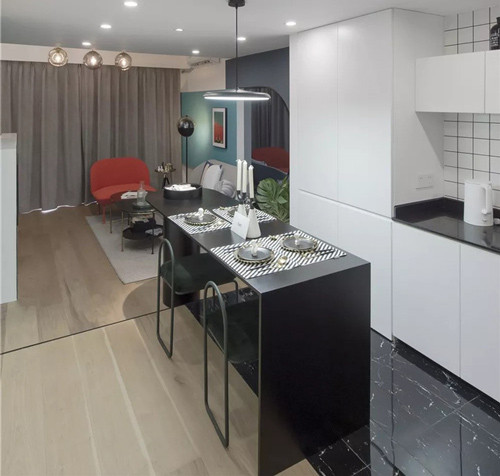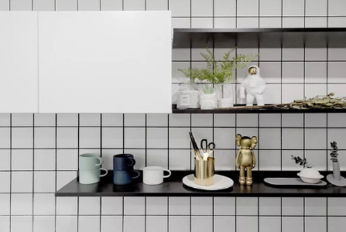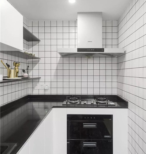 Khu bếp nhỏ dạng chữ L ốp gạch trắng đen nổi bật. Hệ thống khử mùi được gia chủ đặc biệt chú ý để không ám mùi nấu nướng ra cả không gian phòng khách.