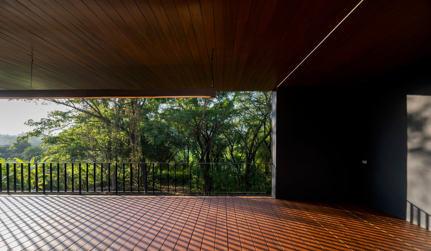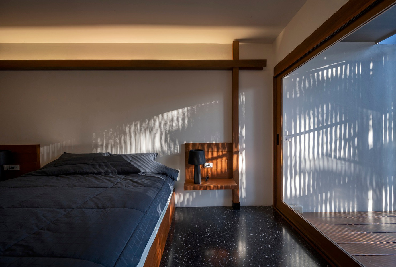 Bên kia hành lang là khoảng không gian thư giãn với những khoảng trống tương tác với nắng, gió và thiên nhiên. Mọi người có thể thư thái nơi đây vào buổi bình minh hay hoàng hôn.