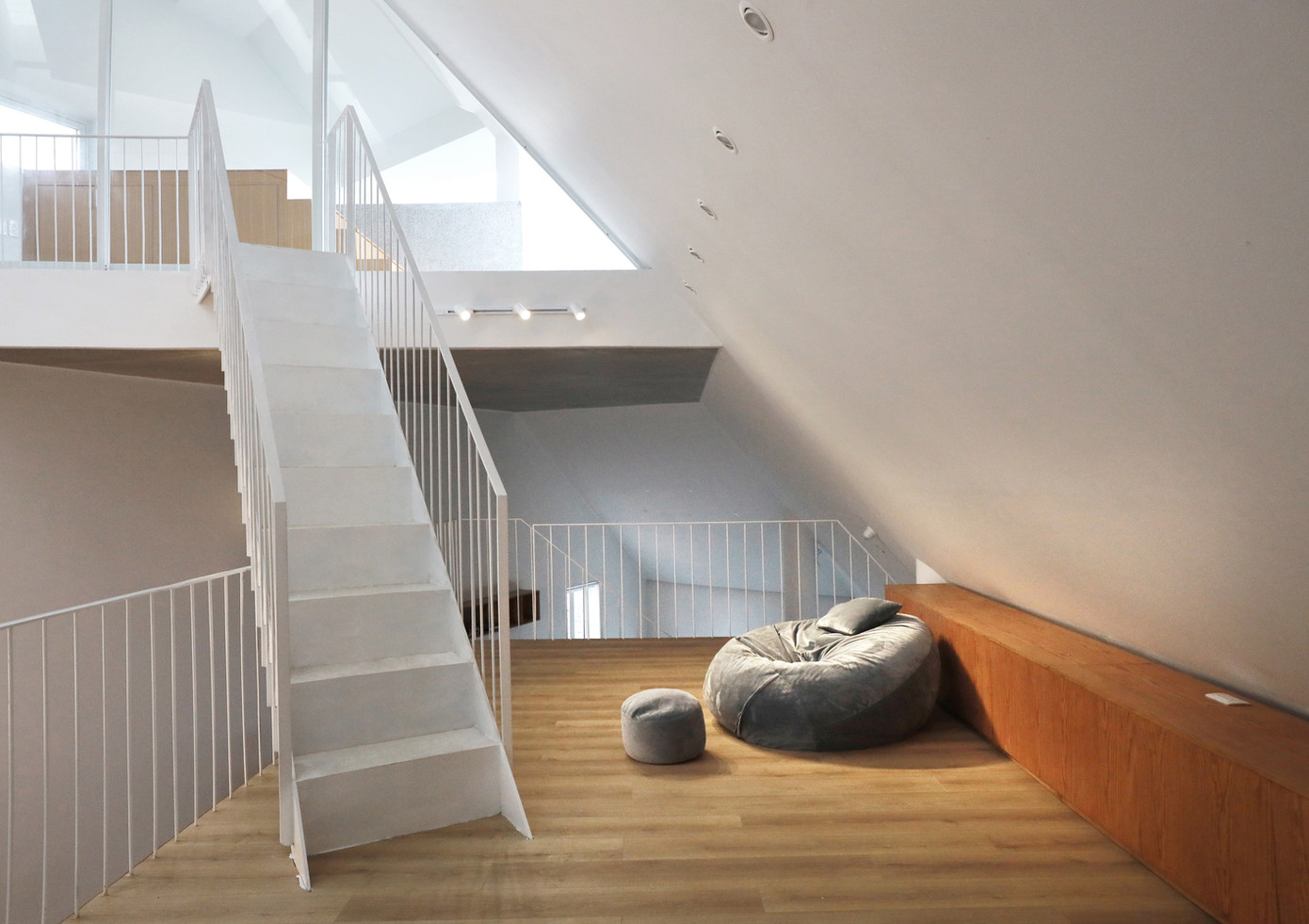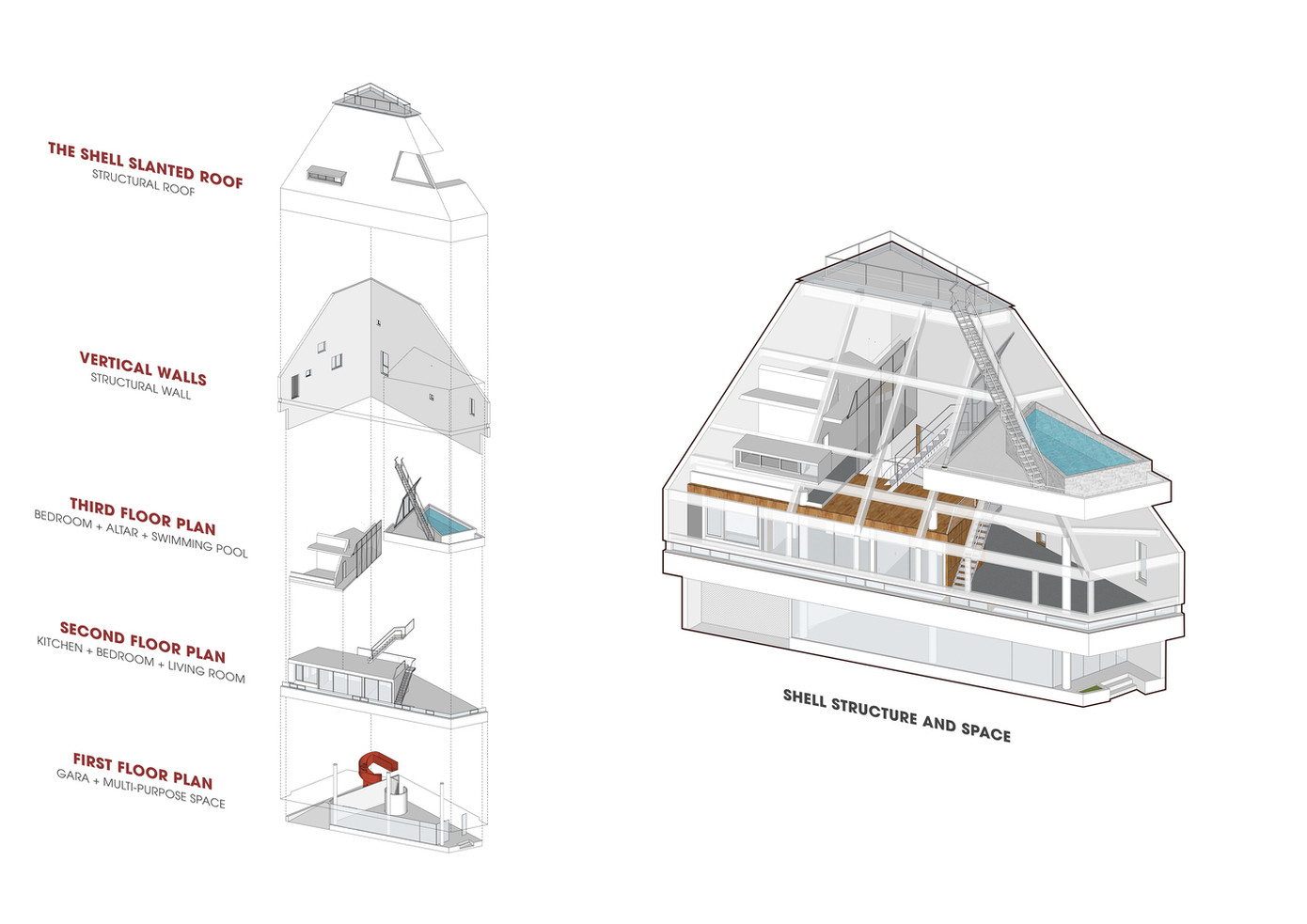 Bằng cách đóng cửa bên ngoài và mở rộng các chức năng bên trong, chức năng phân bổ tạo ra sự thay đổi về diện tích và thể tích theo chiều cao của ngôi nhà. Hệ thống cầu thang bộ là điểm chuyển tiếp cho các trục giao thông, giúp tăng cường sự kết nối giữa các thành viên. Nó còn nhằm mục đích tạo ra một trải nghiệm, một cuộc dạo chơi trong một không gian đầy tự do. Mỗi bước là một góc nhìn khác nhau và độc đáo.