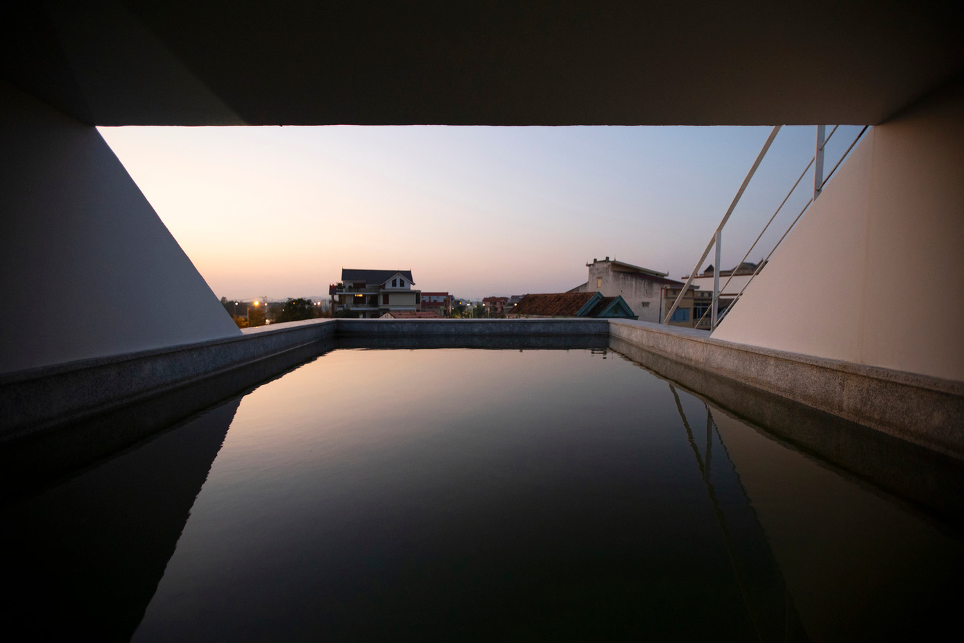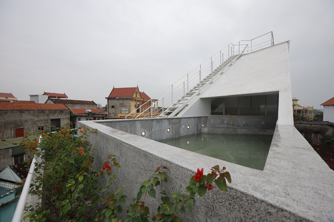 Cuối cùng là hệ mái nghiêng giống như sườn núi, mở ra khung trời êm đềm nhưng vẫn đảm bảo tách biệt với sự ồn ào bên ngoài, tạo sự riêng tư cho gia chủ. Một bể bơi nửa mái kéo dài về hướng Tây, mở ra một bầu trời bao la, bồng bềnh và đầy cảm xúc. Có một cầu thang dài dẫn lên mái nhà, giúp ngôi nhà giống như một đài quan sát toàn cảnh, tận hưởng những khoảnh khắc tươi đẹp mà thiên nhiên mang lại.