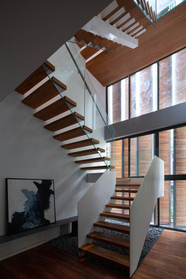 Một khu vực cầu thang khác được kết hợp giữa kính và gỗ. Điểm nhấn chính là tấm thảm màu xám ở chân cầu thang, tạo thành một góc nghỉ ngơi thư giãn rất hợp lý.