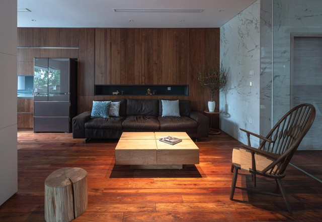 Phòng khách hiện đại được trang trí với vật liệu gỗ giúp không gian trở nên sang trọng, ấm cúng hơn.
