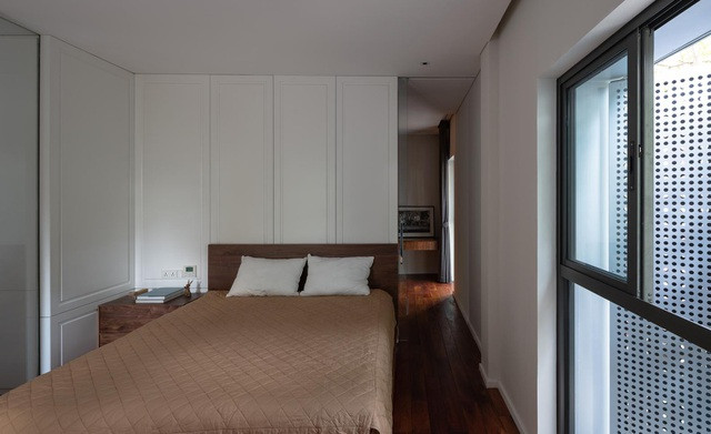 Phòng ngủ chính được thiết kế một cách đơn giản, trang nhã. Cửa sổ lớn cạnh giường ngủ giúp căn phòng sáng sủa hơn.