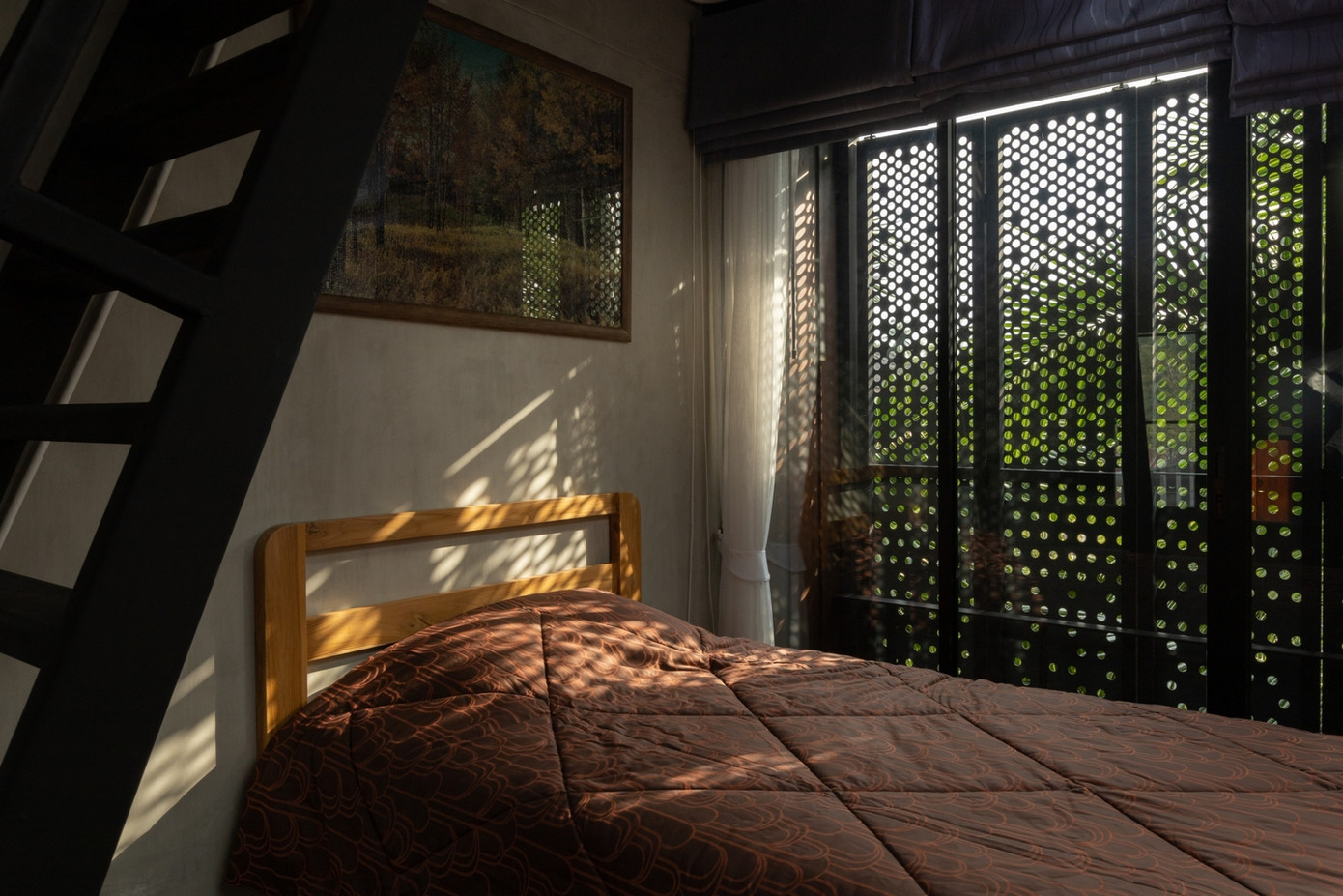Bên cạnh đó, cửa sổ được thiết kế hai lớp để thích nghi với khí hậu nhiệt đới. Lớp thứ nhất là cửa kính trượt giúp gia tăng tối đa nguồn sáng tự nhiên và lớp thứ hai là kim loại đục lỗ trang trí để chắn ánh nắng gay gắt khi cần thiết. Vào ban đêm, ánh sáng bên trong lọt qua lỗ hở trang trí, tạo hiệu ứng lập lòe như bầy đom đóm trong khu vườn tĩnh lặng.