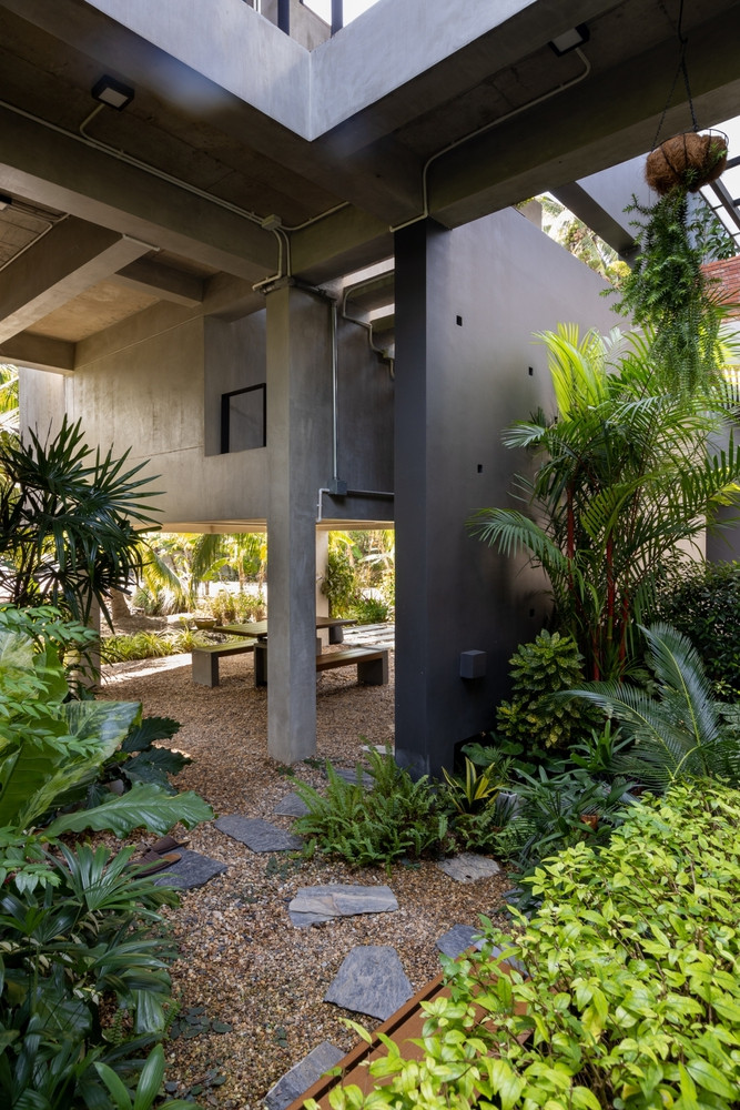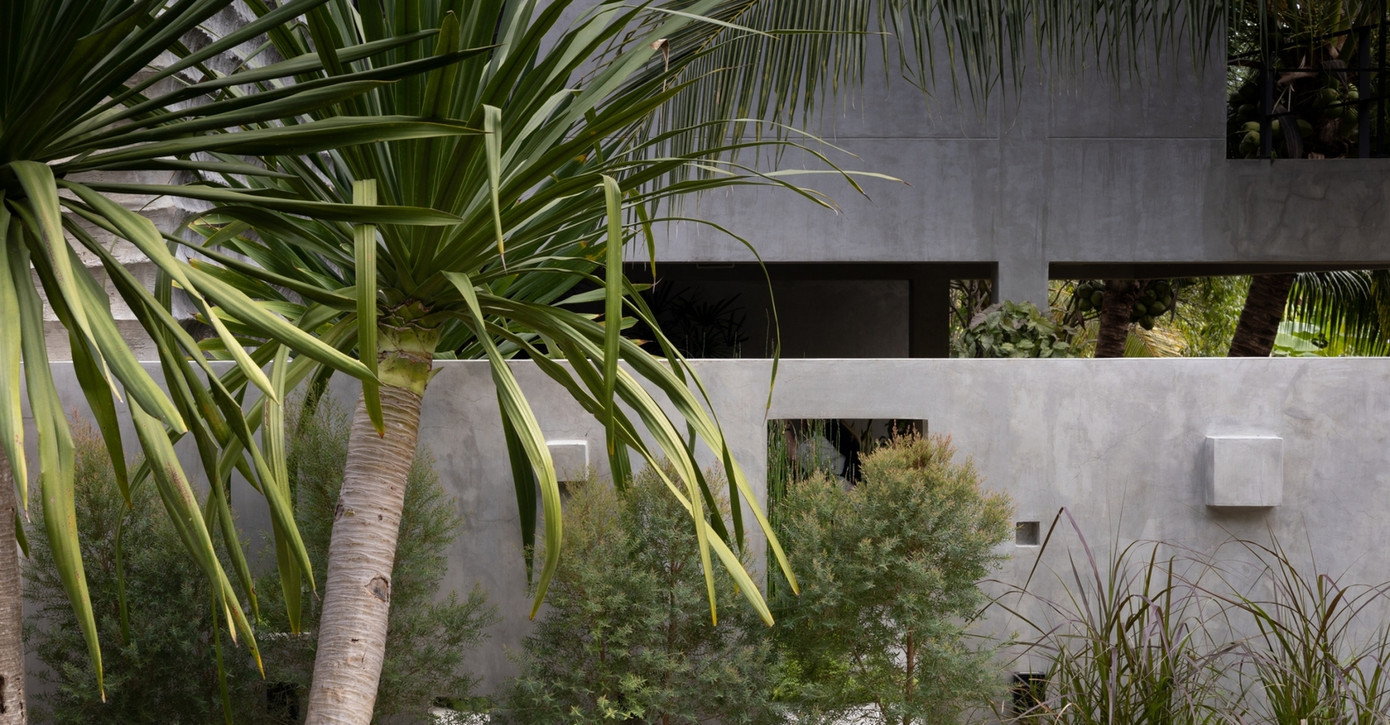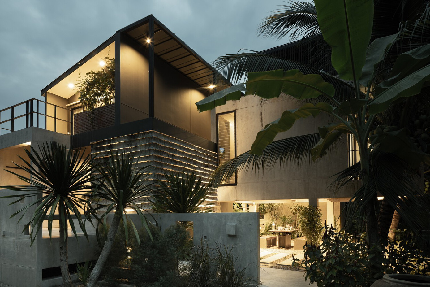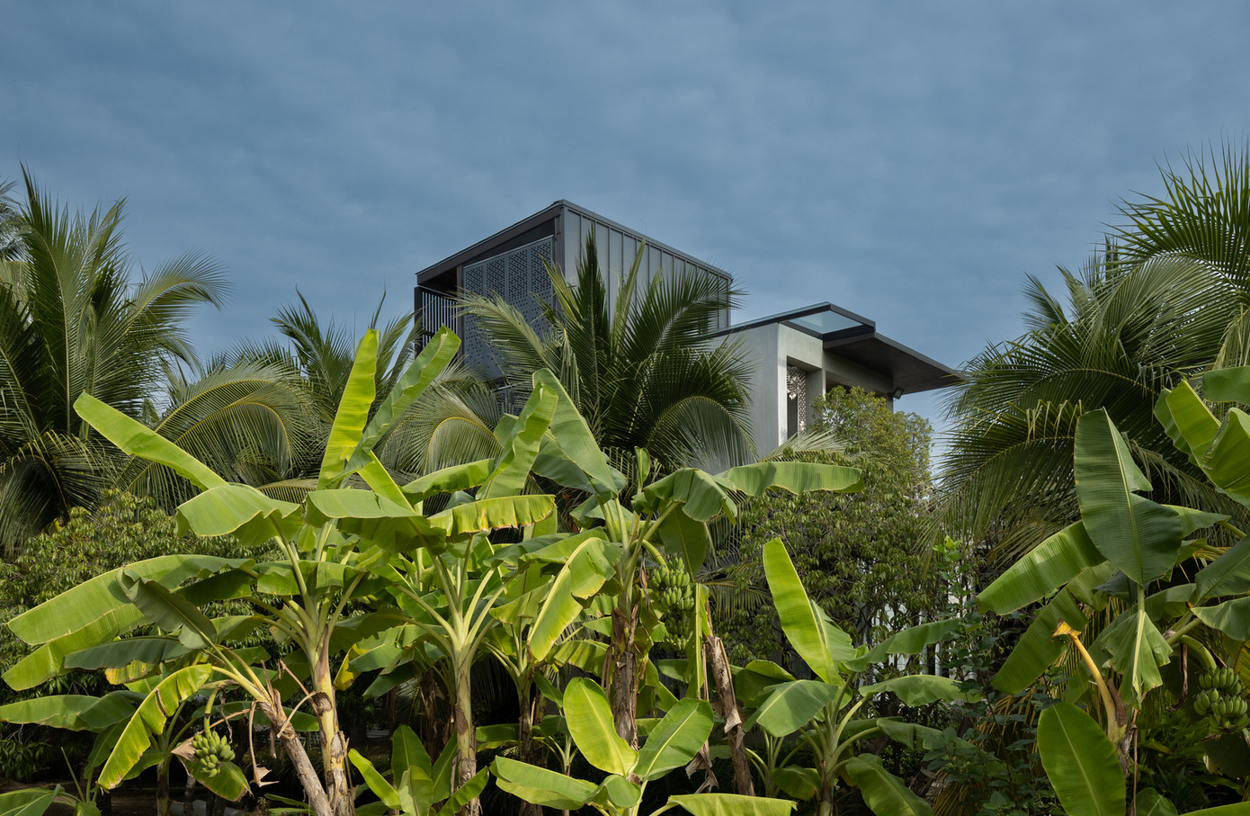Với mong muốn của gia chủ về một không gian sống hòa hợp với bối cảnh, bảo tồn tối đa vườn dừa và mương nước, ngôi nhà được thiết kế chia thành nhiều khối nhỏ theo chức năng với những lối đi bao quanh bởi vườn cây.